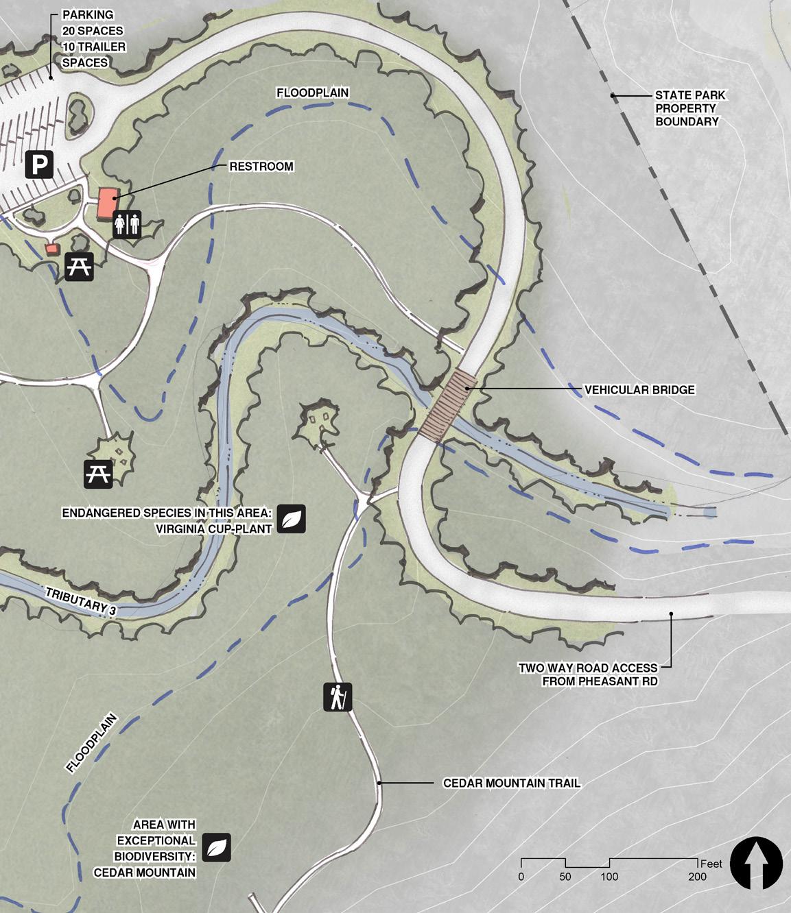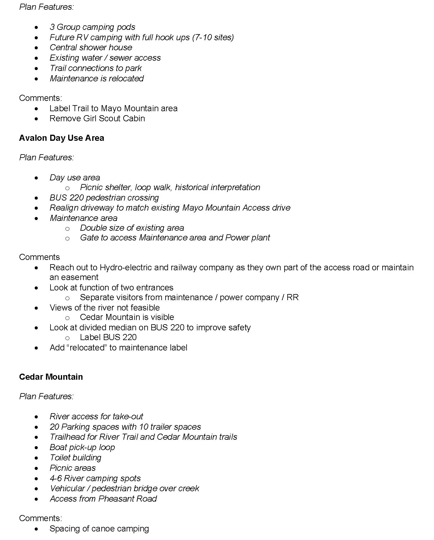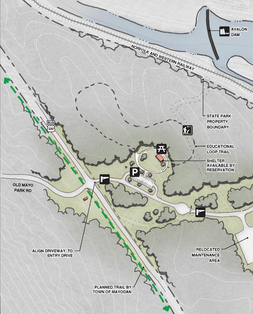 HARRY ROAD ACCESS Camping Conservation Potential Ranger Residence No current public sewer service AVALON MILL VILLAGE Historical interpretation Day use (trail, picnic shelter) New maintenance facility Beginning of Mill Trail to Washington Mill site No access to river MAYO MOUNTAIN ACCESS Camping (group, family/car, camper cabins) Hiking Day use (picnic, fishing) Larger maintenance facility No current public sewer service CEDAR MOUNTAIN Canoe / kayak river access Hiking Trailhead with parking Ecological recreation (Bird watching, wildflower prairie, controlled burns) Access from Pheasant Road OPPORTUNITY SITE G OPPORTUNITY SITE I OPPORTUNITY SITE H OPPORTUNITY SITE J Existing river access not owned by State. Needs improvement. Pedestrian access under BUS 220 bridge (coordinate with NCDOT) Poor access to river (steep slopes, rapids) I H H J J G OPPORTUNITIES / MAYO MOUNTAIN ACCESS MAYO RIVER STATE PARK SOCIAL TRAILS RAILWAY KEY ACCESS ROADS SENSITIVE SPECIES NHP: NATURAL AREA POTENTIAL TRAIL VIEWS FLOWLINES FLOODWAY FLOODPLAIN (100YR) FLOODPLAIN (500YR) WETLANDS WATERBODIES RAPIDS BLUFFS LEGEND