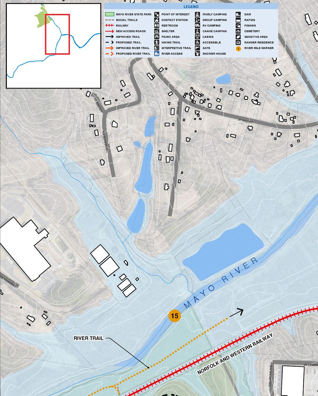 D Ecological preservation OPPORTUNITIES / DESHAZO MILL ACCESS MAYO RIVER STATE PARK SOCIAL TRAILS RAILWAY KEY ACCESS ROADS SENSITIVE SPECIES NHP: NATURAL AREA POTENTIAL TRAIL VIEWS FLOWLINES FLOODWAY FLOODPLAIN (100YR) FLOODPLAIN (500YR) WETLANDS WATERBODIES RAPIDS BLUFFS LEGEND