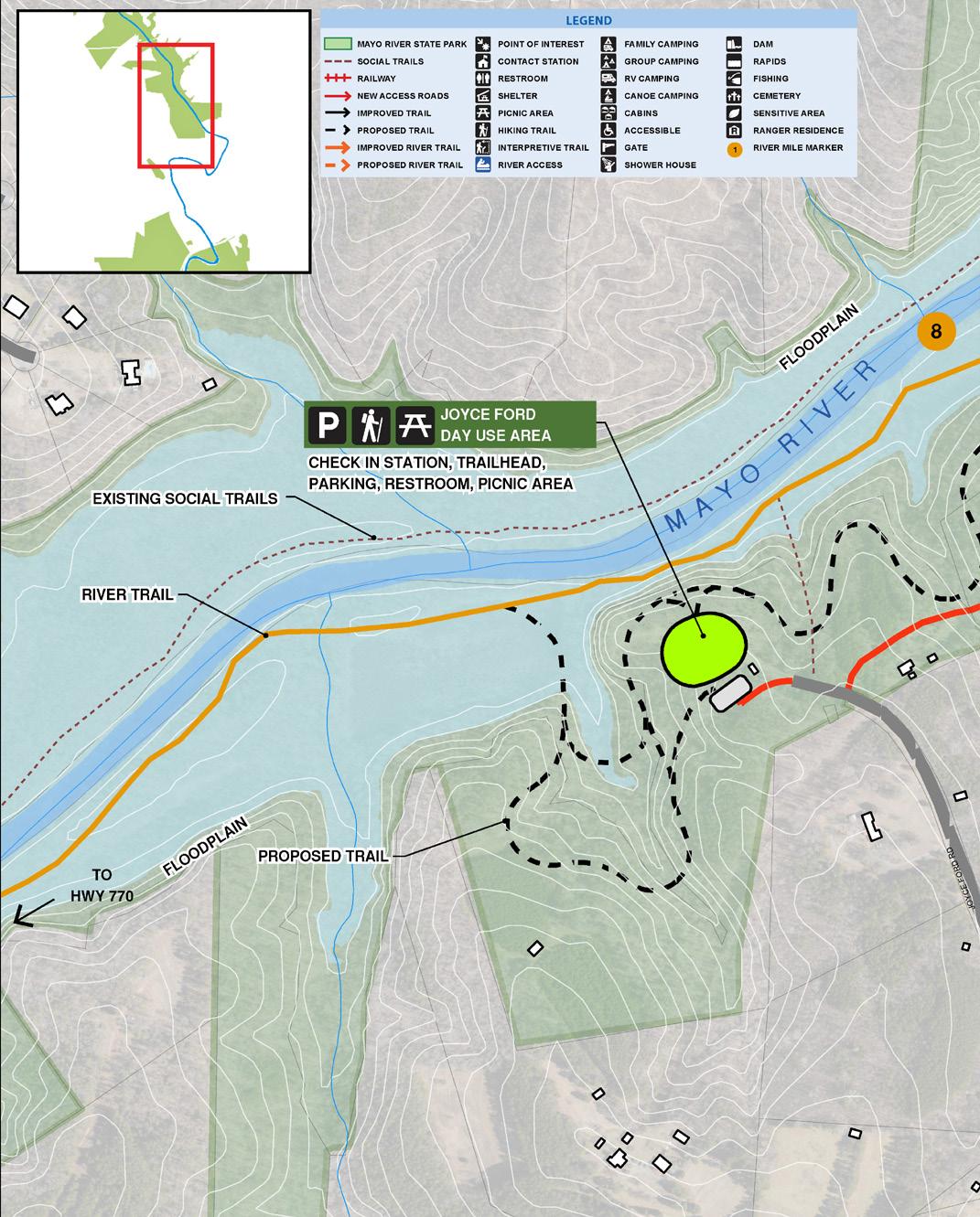 This section includes several smaller park parcels with limited river access along the Mayo River corridor The Joyce Ford Road access is the exception, though access is somewhat limited This section, however, does provide continuous river frontage that connects many of the parcels, allowing for river access along the Mayo
