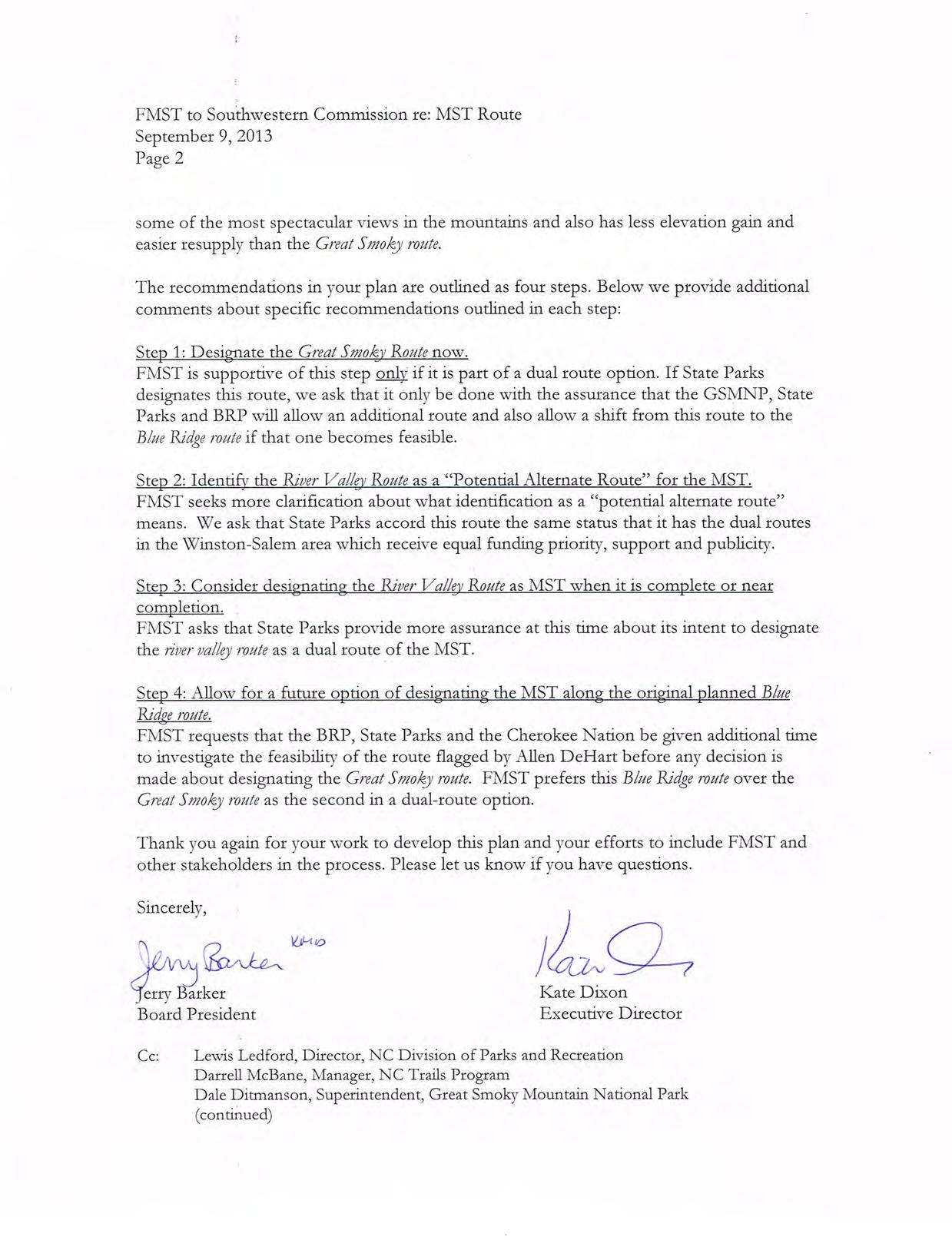 This letter is written on behalf of the North Carolina Bartram Trail Society, of which I am President. We have received a copy of Brent Martin’s letter on behalf of The Wilderness Society, and we wish to endorse the alternate route of the proposed MST trail described in his letter to you. As you may be aware, we are an all-volunteer hiking organization with some 200 members, and we maintain and operate a 70-mile trail that generally follows the path taken by the naturalist William Bartram when he made his celebrated visit to Western North Carolina in 1775. Our trail connects in two places with the Appalachian Trail.