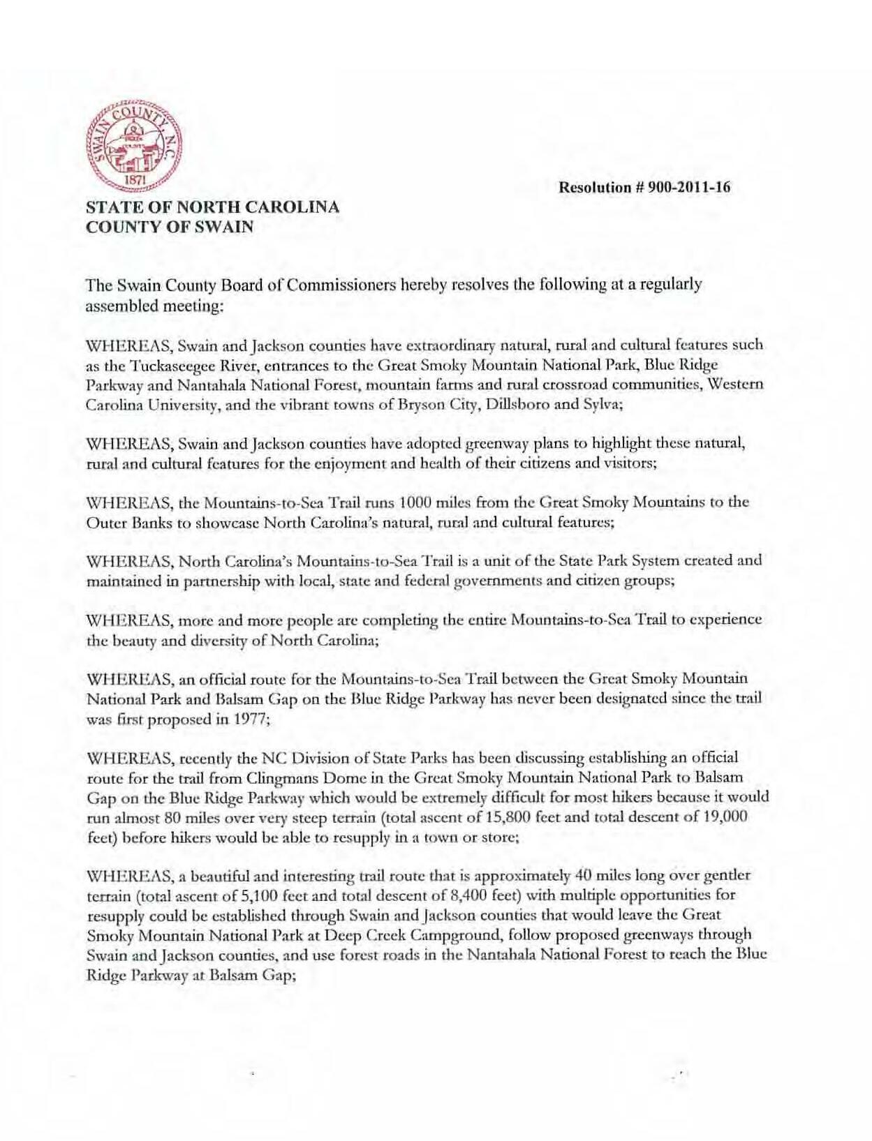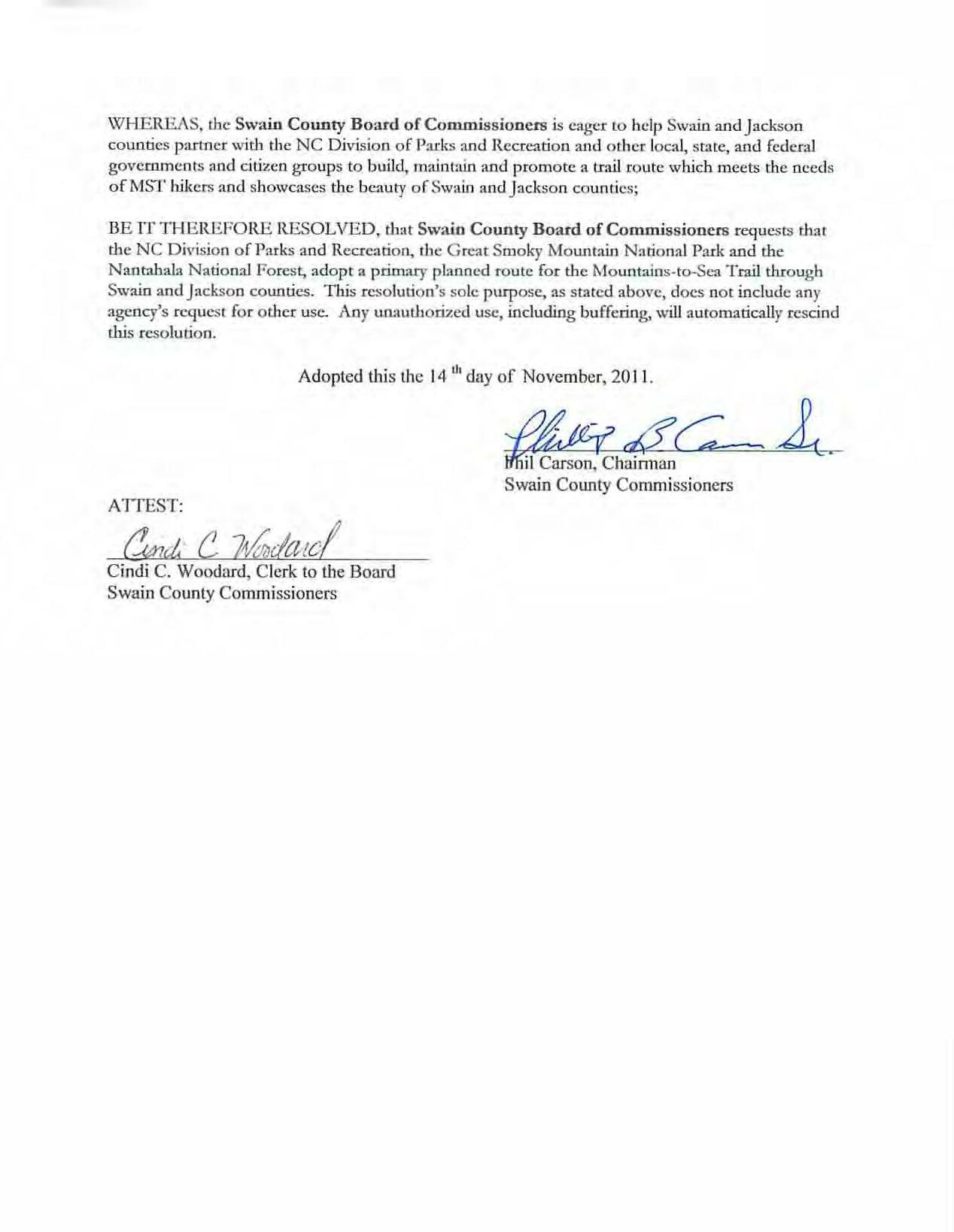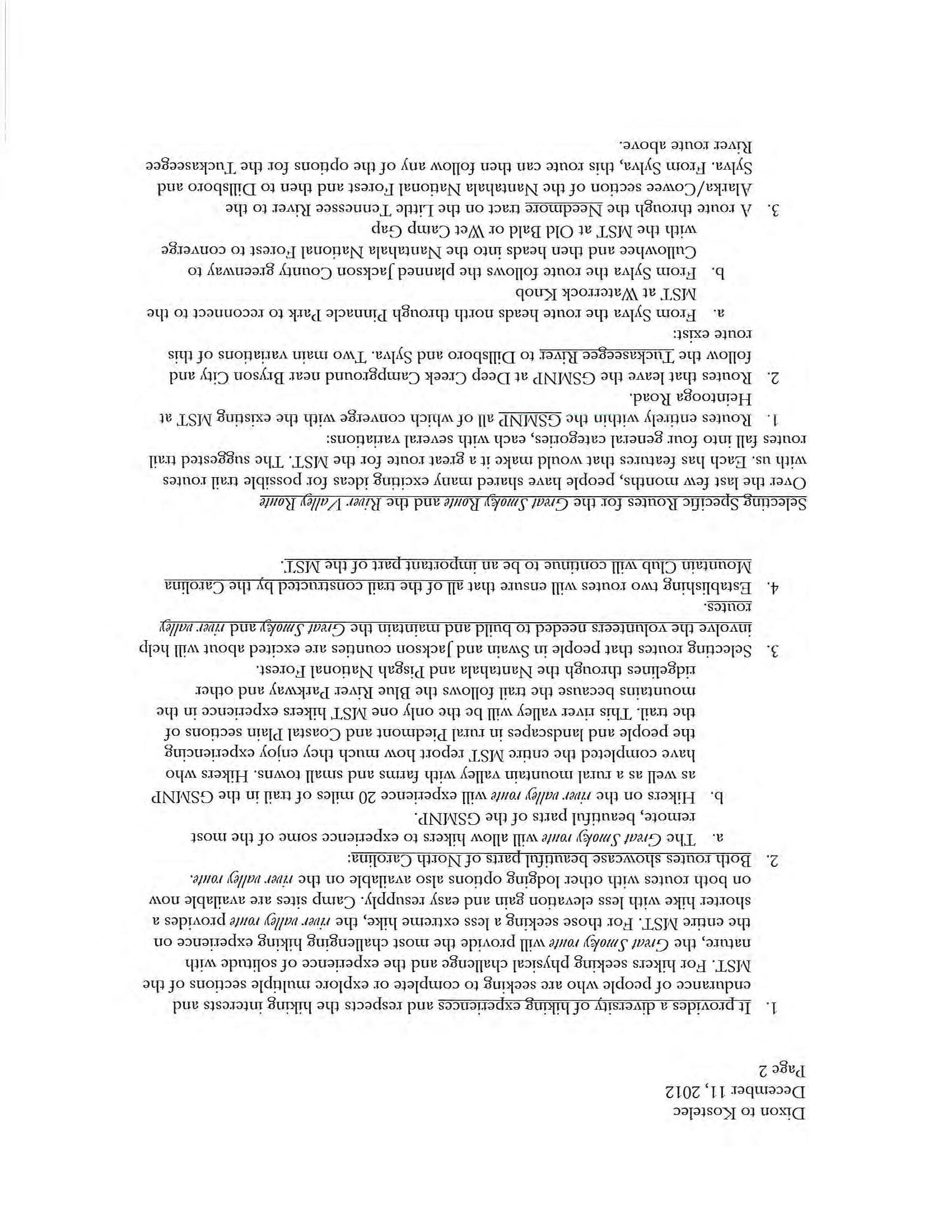 promotion, and enjoyment. Creation of a trail system there alone (without connection to MST) would be great, but its potential skyrockets when all are brought together. 5. Lastly, the beautiful counties of Southwestern North Carolina deserve not to be overlooked, especially Macon, when it comes the the creation of routes that traverse our area. A few examples...the Blue Ridge Parkway goes through Buncombe, Haywood, Jackson, and Swain. The Great Smokies Railroad travels through Jackson, Swain and Cherokee. The Great Smoky Mountains Expressway travels through Haywood, Jackson, and Swain. I know, historically, that counties like Macon, Clay, and Cherokee had established trade routes with North Georgia due to the ease of traversing goods in that direction in those days. Those days are over and the counties of Southwestern NC offer so much to the public that is ready to be utilized. Macon is a proud and "unreasonably undiscovered constiuent" of WNC and would play a great and deserving host to the MST!!