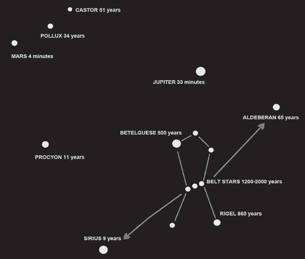 The exercise I’m proposing here is to go outside before dawn on clear night sometime this November and try to force your brain to appreciate the three-dimensionality of what, without additional information, makes everything look equidistant, as if on a dome. The easily recognizable constellation of Orion is a useful starting point, with the addition of several other bright stars and two planets: Mars and Jupiter. First, orient yourself by looking up toward the southwest, away from bright lights, and you’ll see Orion the Hunter striding manfully across the sky. The three stars of his belt point roughly to Aldeberan (up and right) and Sirius (down and left). Look above Orion’s head and there’s Jupiter, almost overhead and brighter than anything else. Now locate dimmer and slightly rust-colored Mars by finding Gemini, the Heavenly Twins Castor and Pollux, off to the left; Mars is a little below this pair. In the diagram, I’ve shown about how long it takes light from these celestial