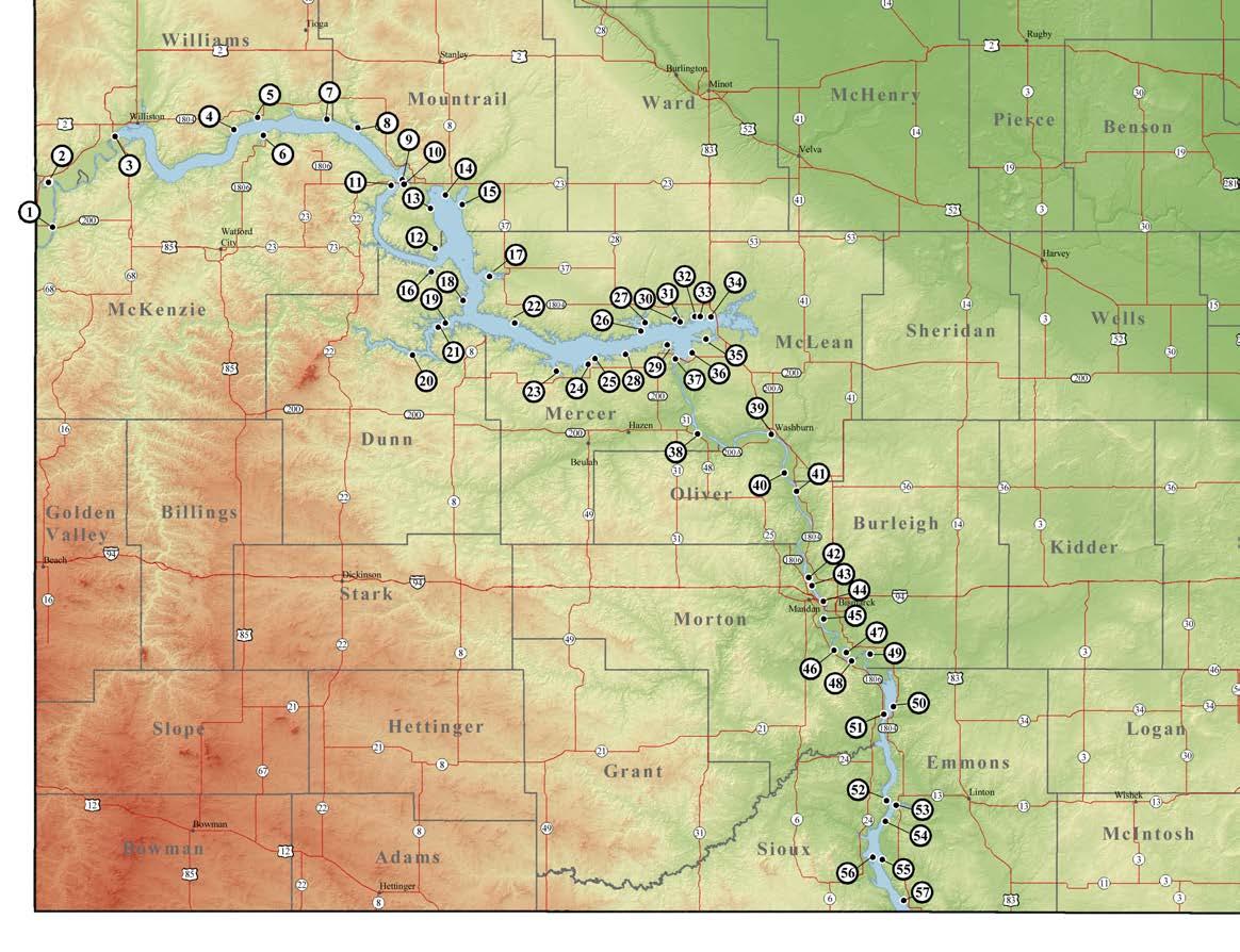 south of Dunn Center. Extreme low water levels due to issues with the dam. Boat ramp not usable. Contact U.S. Fish and Wildlife Service with questions. (Fishing pier).