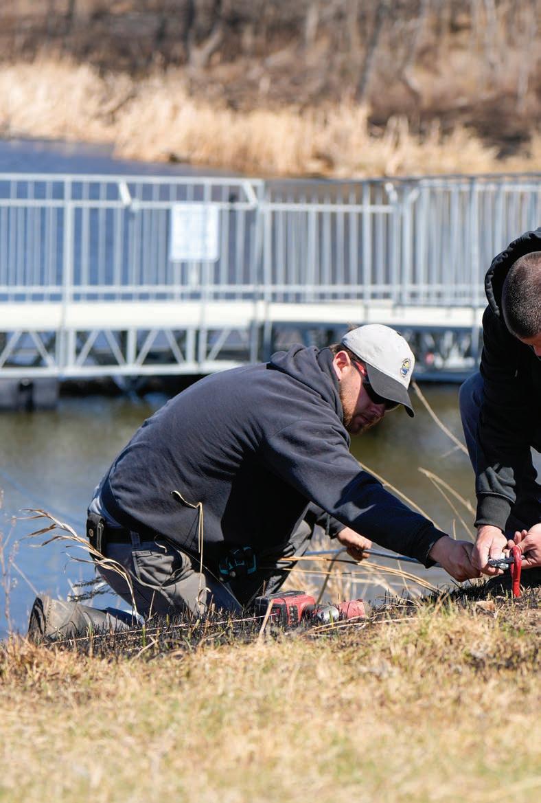 Jacob Heyer (left) and Kyle Hoge, Game and Fish Department fisheries development specialists, anchor a new fishing pier at Coal Lake in McLean County earlier in spring.