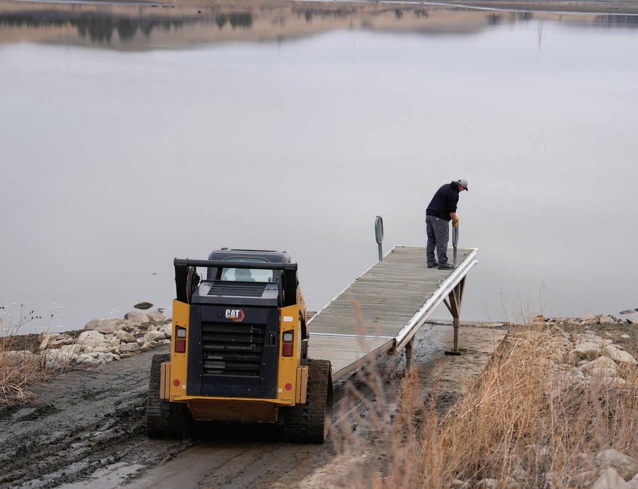 On April 3 and days that followed, more than 2,000 northern pike caught in trap nets were hauled to Cottonwood Park Pond in Bismarck to provide opportunities for anglers. Samples were taken from shortnose gar, a primitive fish that is often referred to as a living fossil, for research purposes. A courtesy dock is pushed into place at Lake Oahe’s Beaver Bay.