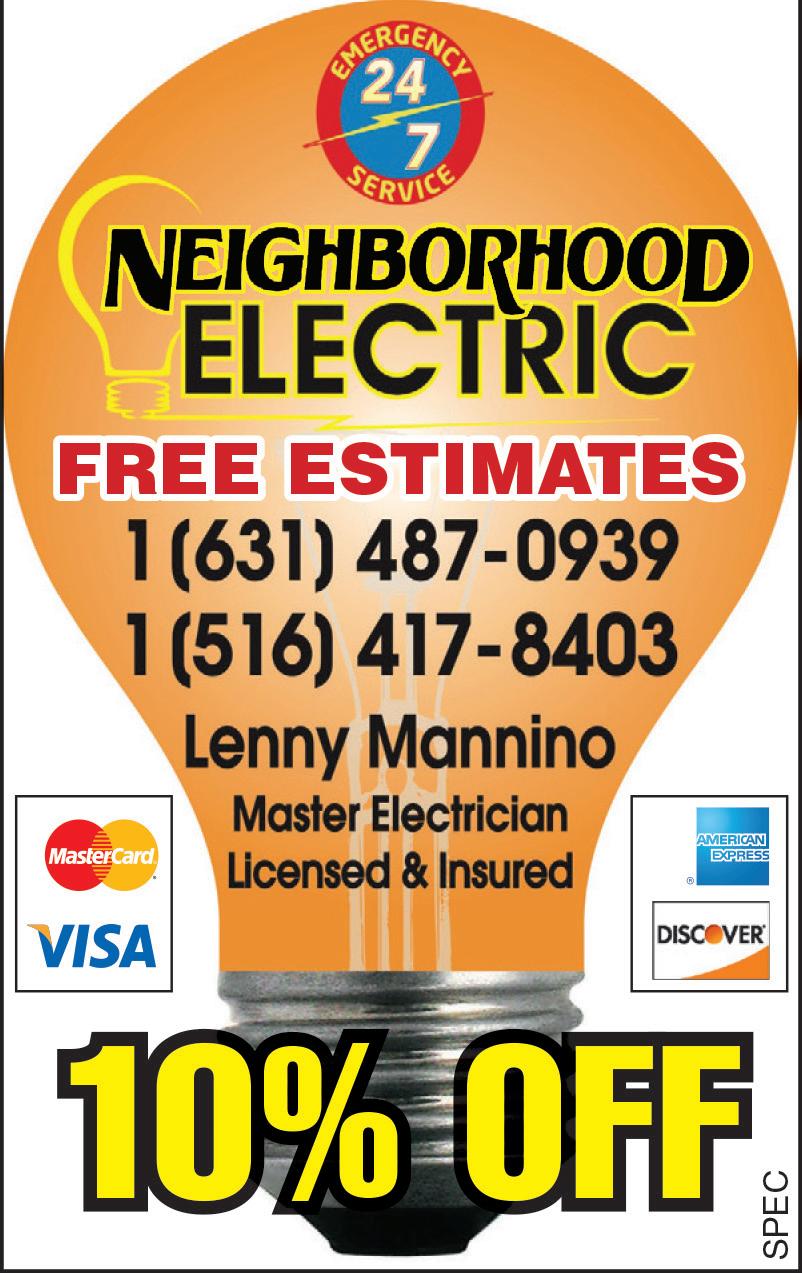 16 AMITYVILLE SOUTH BAY’S NEIGHBOR NEWSPAPERSWEDNESDAY DECEMBER 14, 2022 • WWW.LONGISLANDMEDIAGROUP.COM ROOFING STORM SPECIALISTS FREE ESTIMATES COMMERCIAL & RESIDENTIAL • ROOFS • SHINGLES • FLAT ROOFS • REPAIR SPECIALISTS LEADERS & GUTTERS • GAF CERTIFIED INSTALLERS 10% MILITARY DISCOUNT/ SENIOR DISCOUNT (MUST SHOW ID) AVAILABLE TO WORK IN ALL TYPES OF WEATHER Above All ROOFING Better Business Bureau Member CALL TODAY! Lic./Ins. #16739H.I. #HI8B43900000 WWW.ABOVEALLROOFINGLI.COM 631-665-3158 Ask About Our Extended Manufacturer’s Warranty. 380228N0121422 CHIMNEY SERVICE DONE BY FIREFIGHTERS THAT CARE SINCE 1982 STAINLESS STEEL LINERS CLEANING & REPAIR SPECIALISTS CHIMNEYS REPAIRED, REBUILT & TUCKPOINTING FULLY LICENSED & INSURED WWW.CHIMNEYKINGINC.COM CHIMNEY KING ENT, INC. NYC License # 2061397-DCA • Nassau County License # H0708010000 Suffolk County License # 41048-H 516-766-1666 • 631-225-2600 407008N121422 FREE ESTIMATES MASONRY SPECIALIST TREE SERVICE DANK, INC Tree Experts FREE ESTIMATES 516-799-1331 631-254-0059 • Tree Removal • Stump Grinding • Pruning • Land Clearing Policeman, Fireman, Senior Discounts CODE: SB495 407007N121422 OWNER OPERATED Nassau License # H2081200000 Suffolk License # 45806-H Nassau Office Suffolk Office 10% OFF Any Job Over $500 Must Present Coupon At Time Of Estimate. We’ll Meet & Beat Any Price! GARAGE DOORS G&M Garage Doors 631-277-3450 BROKEN SPRING REPAIR SPECIALIST SAME DAY SERVICES SUPERIOR QUALITY & COURTEOUS SERVICE VINYL, STEEL, WOOD, FIBERGLASS RESIDENTIAL & COMMERCIAL FREE ESTIMATES VISIT OUR SHOWROOM 254 ISLIP AVE., ISLIP 406950N121422 www.gandmgaragedoors.com OSHA Qualified Clopay Authorized Dealer Family Operated Since 1987 FUEL OIL GENESIS FUEL OIL 631-249-1438 www.genesisfueloil.com • HEAP ACCEPTED • SAME DAY DELIVERY • ON SITE FLEET FILLING AVAILABLE • DIESEL & OFF ROAD DIESEL • CREDIT CARDS SAME AS CASH • OPEN 7 DAYS A WEEK $4 OFF With Mention Of This Ad 369823N121422 ELECTRICAL SERVICES 326155N121422 10% OFF PLUMBING REPAIRS PLUMBING STOPPAGES CORRECTED • Sewer Lines Electrically Cleaned • Sinks • Tubs • Washer Lines • Clogged Toilets • Septic Pumping Dec. 1A-787 • Chemicals • Cesspool Certification • Leaky Toilet Keeps Running • Loose Tank & Bowl • Leaky Sink Drain & Pipes • New Toilets Installed • Faucets Installed • Outside Faucet Leak • New Sinks & Gas Stoves Installed • Baseboard & Radiators • PEX Piping • Ejector Pumps • Dishwashers • Ice Makers • Gas Dryers & Pipes Installed Lic./Ins. CALL DAY/NIGHT CELL $25 OFF ANY REPAIR FREE ESTIMATES 516-924-4249 • 631-888-4006 MASTER PLUMBER LICENSED BABYLON, ISLIP, & INCORPORATED VILLAGE OF LINDENHURST CALL MIKE PLUMBING REPAIRS 363808N121422 CALL MIKE FUEL OIL H.E.A.P. ACCEPTED | SE HABLA ESPANOL LET US KEEP YOU WARM WITH OUR GREAT CUSTOMER SERVICE. YOU ARE OUR #1 PRIORITY! HAPPY HOLIDAYS! “King Of Price Breakers” No One Gives A Better Price Forgetaboutit! WE ACCEPT ALL CREDIT CARDS RANDAZZO FUEL SUFFOLK & NASSAU (631) 587-8267 407013N121422 $10.00 OFF WITH MENTION OF THIS AD EXPIRES 1/31/23 SIDING SIDING IS OUR SPECIALTY Siding • Trim Work • Windows Repairs • Gutters • Leaders • Capping INSULATE YOUR HOME AND SAVE ON YOUR ENERGY BILLS LOWEST PRICES OF THE SEASON! Deal Direct with Owner & SERVING YOUR AREA FOR OVER 20 YEARS V&P Siding & Window Corp. LICENSED/INSURED Lic. #27369-HI WE ACCEPT 631-321-4005 SAVE BIG $$$ NO JOB TOO BIG... NO JOB TOO SMALL!! CALL NOW FOR FRONT OR FULL HOUSE SPECIALS! 407174N121422 NEIGHBOR NEWSPAPERS SERVICE DIRECTORY Call 631-226-2636 To Place Your Ad