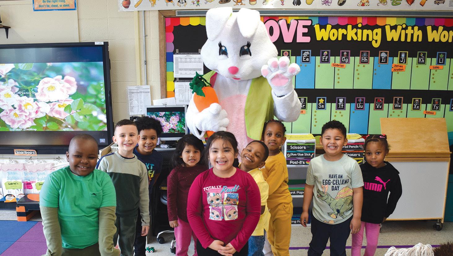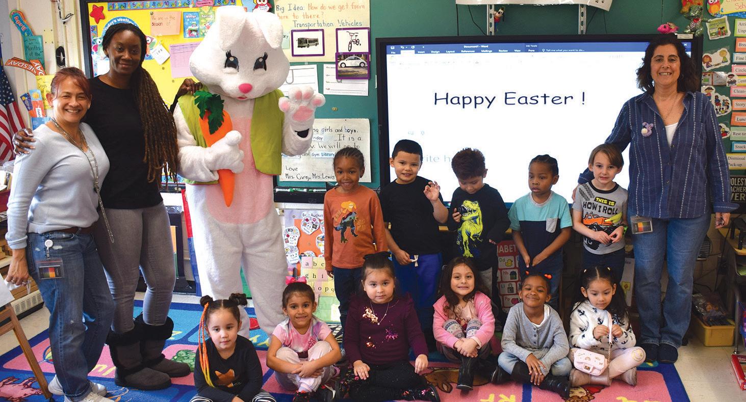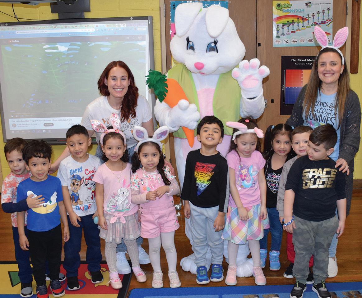 EASTER BUNNY VISITS - The Easter bunny hopped into classrooms at Northeast Elementary School in Amityville on March 31. Pre-kindergartners jumped out of their seats to give the Easter bunny a warm hug. Some of the students also expressed their love for the Easter bunny by wearing rabbit ears and eating tasty Easter eggs. Photos courtesy of Amityville Union Free School District