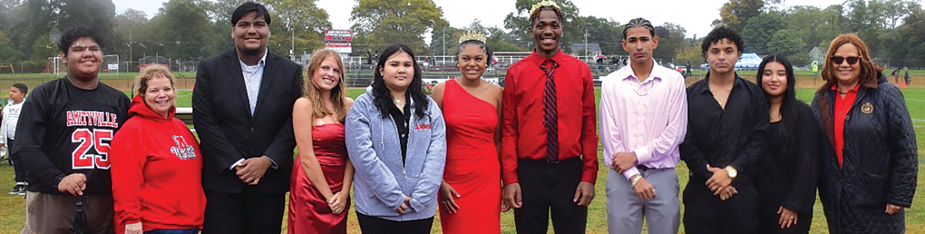Amityville School District Superintendent of Schools Dr. Gina Talbert, far right, celebrated the high school’s homecoming court. Adonis Lyons and Tiffany Asbell were crowned homecoming king and queen.