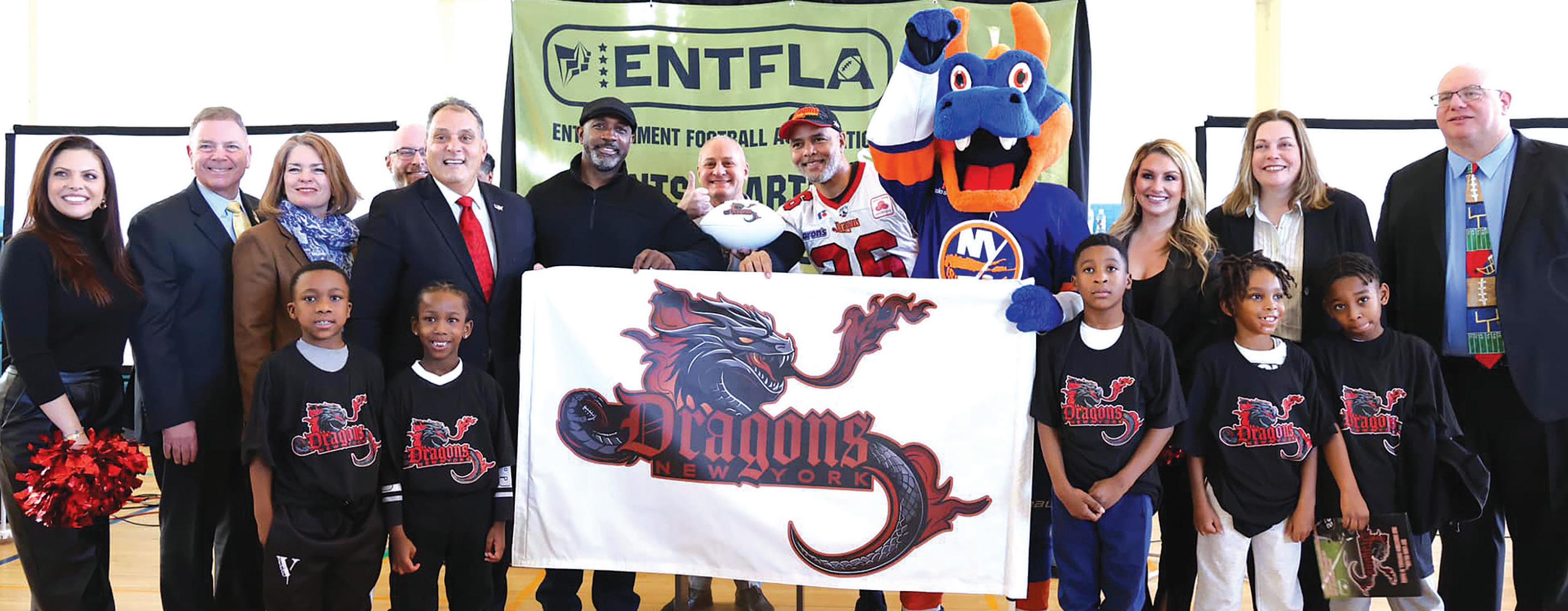 Recently, New York State Senator Steve Rhoads joined Town of Oyster Bay Supervisor Joseph Saladino, Town of North Hempstead Supervisor Jennifer DeSena, and members of the community to celebrate the return of arena football to Long Island. The team is bringing back a fan-favorite name, the New York Dragons! The