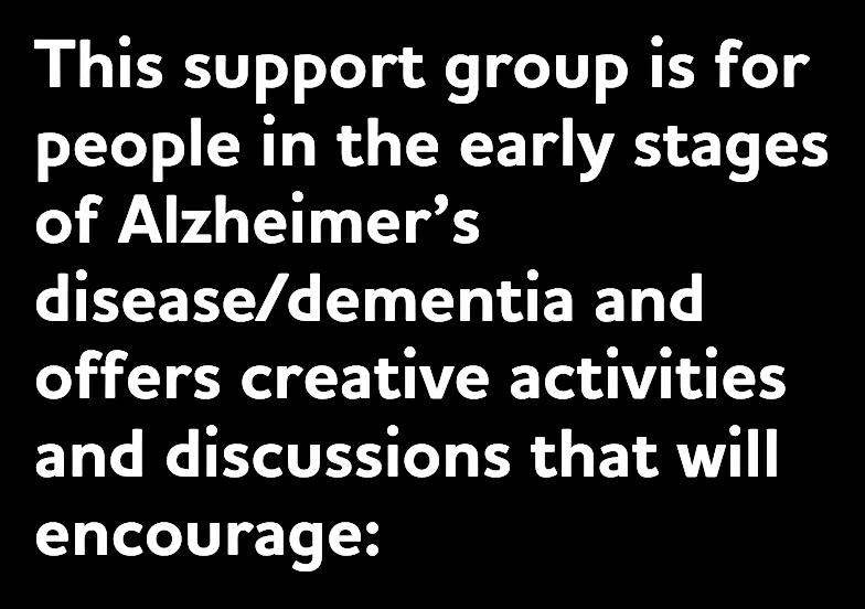 This support group is for people in the early stage of Alzheimer’s disease/ dementia and offers