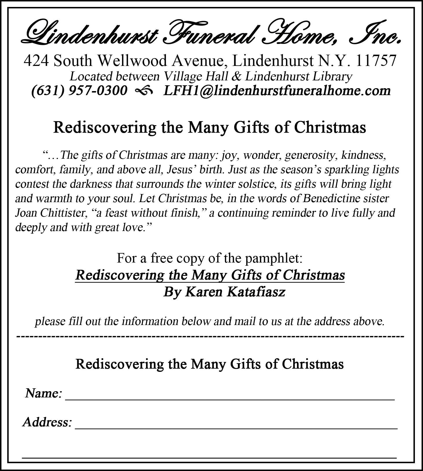 14 COPIAGUESOUTH BAY’S NEIGHBOR NEWSPAPERSWEDNESDAY DECEMBER 7, 2022 • WWW.LONGISLANDMEDIAGROUP.COM J. F. GOODE FUNERAL HOME 545 ALBANY AVENUE AMITYVILLE, NY 11701 Dignified Service With Affordability