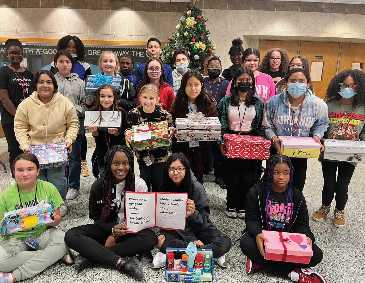 STUDENT COUNCIL COLLECTS CARE BOXES - The Copiague Middle School Student Council collected and donated Blessings in a Box for Keep Your Change in Amityville. The Blessings in a Box were decorated shoe boxes filled with hygiene products, winter wear, gift cards, toys etc. Keep Your Change adopted several homeless shelters and teen foster care homes. Residents were served a sit-down dinner and each attendee was gifted a blessing in a box. The members of student council were excited to be able to contribute to such a great cause during the holiday season. Photo courtesy of Copiague School District