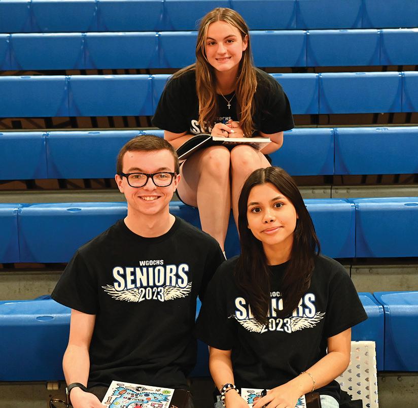 during Senior Day on June 13. With their yearbooks in hand, the students donned their senior shirts as they gathered outside to enjoy the sunshine, barbeque and time with their classmates. Faculty and staff joined