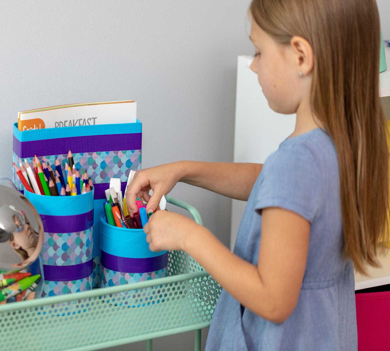 space to store supplies and paperwork is key to staying organized. Let kids take pride in this space so they want to spend time studying there by having them create their own accessories and decorating them to their liking. Duck Tape provides an easy, inexpensive way to add flair to school gear. Cover notebooks and folders in a favorite Duck Tape design, customize desk organizers and décor with cool ontrend colors, or craft one-of-a-kind creations, like pencil pouches and tablet covers. Available in more than 250 colors, designs and licenses, there’s a roll to suit any kid’s style.