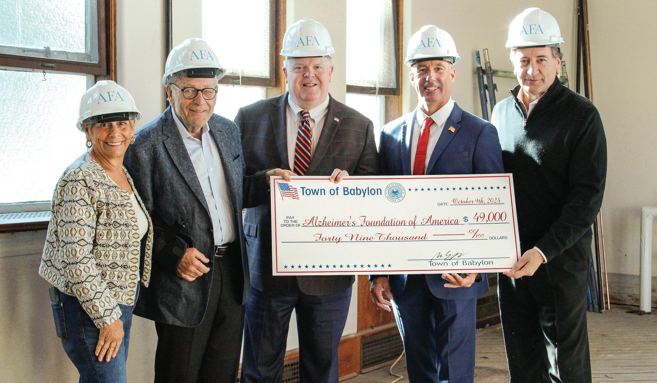 - With the Long Island region facing the epidemic of Alzheimer’s, help is on the way for families and those afflicted with the disease as construction continues on the Alzheimer’s Foundation of America’s (AFA) new Education & Training Center in Amityville, with the help of a $49,000 grant from the Town of Babylon. Announcing the grant within the Center’s ongoing construction space are (left-to-right) Babylon Town Clerk Gerry Compitello, Bert Brodsky, AFA Founder and Board Chair, Babylon Town Supervisor Richard Schaffer, Babylon Town Councilman Terence McSweeney, and AFA President and CEO Charles Fuschillo. When completed in the opening days of 2025, the facility will provide essential services for the estimated 60,000 Long Island families currently facing Alzheimer’s as well as offer valuable training for the region’s professionals who assist them.