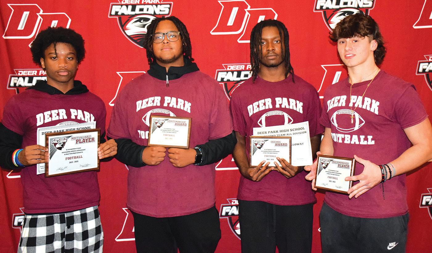 TOP HONORS FOOTBALL PLAYERS - From left, Deer Park High School football players Hayden Lovinsky, Christopher Rodriguez, Jovani Elysee-Holloway and Joseph DeSimone received top honors during the fall sports award ceremony.