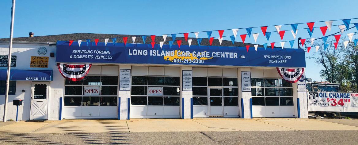 20 DEER PARK SOUTH BAY’S NEIGHBOR NEWSPAPERSWEDNESDAY, MARCH 22, 2023 • WWW.LONGISLANDMEDIAGROUP.COM LONG ISLAND CAR CARE CENTER INC. 333 BAY SHORE ROAD • DEER PARK • 631.213.2300 HOURS: MONDAY - FRIDAY 8AM-6PM • SATURDAY 8AM-1PM Quick Lube Checklist COMPLETE OIL & FILTER CHANGE CHASSIS LUBRICATION CHECK TRANSMISSION FLUID CHECK DIFFERENTIAL FLUID CHECK BRAKE FLUID CHECK POWER STEERING FLUID FILL WINDSHIELD WASHER FLUID CHECK AIR FILTER CHECK WIPER BLADES CHECK TIRE PRESSURE LUBRICATE DOOR HINGES CHECK PCV VALVE CHECK LIGHTS CHECK BATTERY TERMINAL CHECK ANTIFREEZE COOLANT CHECK BREATHER ELEMENT TECHNICIAN National Institute For AUTOMOTIVE SERVICE EXCELLENCE 409755N032223 HAVE A LARGE COMMERCIAL OR RECREATIONAL VEHICLE? MONTHLY PARKING SPACES AVAILABLE FOR RENT $5 OFF $10 OFF $3499 $14999 SYNTHETIC OIL CHANGE ANY SERVICE OVER $100 REGULAR OIL CHANGE FRONT OR REAR BRAKE PADS Up To 5 Quarts. Cartridge Oil Filters Extra. Reg. $79.99 +TAX +TAX +TAX PER SET Up To 5 Quarts. Cartridge Oil Filters Extra. Electronic Brake Systems Extra Cannot be combined with any other offer. Cannot be combined with any other offer. $4500 $8500 FREE PRE-PURCHASE INSPECTION +TAX +TAX Let Us Inspect The Vehicle Before You Buy It! Radiator Drain/Flush/Fill Green Coolant Up to 2 Gallons. Dex-cool/Euro Coolant Extra With Any Repairs Of $350 Or More Cannot be combined with any other offer. $29999 BRAKES & ROTORS INSTALLED +TAX PER SET Starting At Coated Rotors / Electronic Brake Systems Extra Cannot be combined with any other offer. $7500 FREE SCAN FRONT WHEEL ALIGNMENT ANTI-FREEZE SPECIAL REGULAR OIL CHANGE CHECK ENGINE LIGHT ON?? +TAX Starting At Minivans & SUV's Extra Cannot be combined with any other offer. Cannot be combined with any other offer. Cannot be combined with any other offer. Cannot be combined with any other offer. Cannot be combined with any other offer. Cannot be combined with any other offer. NEW YORK STATE INSPECTIONS DONE HERE Se Habla Español