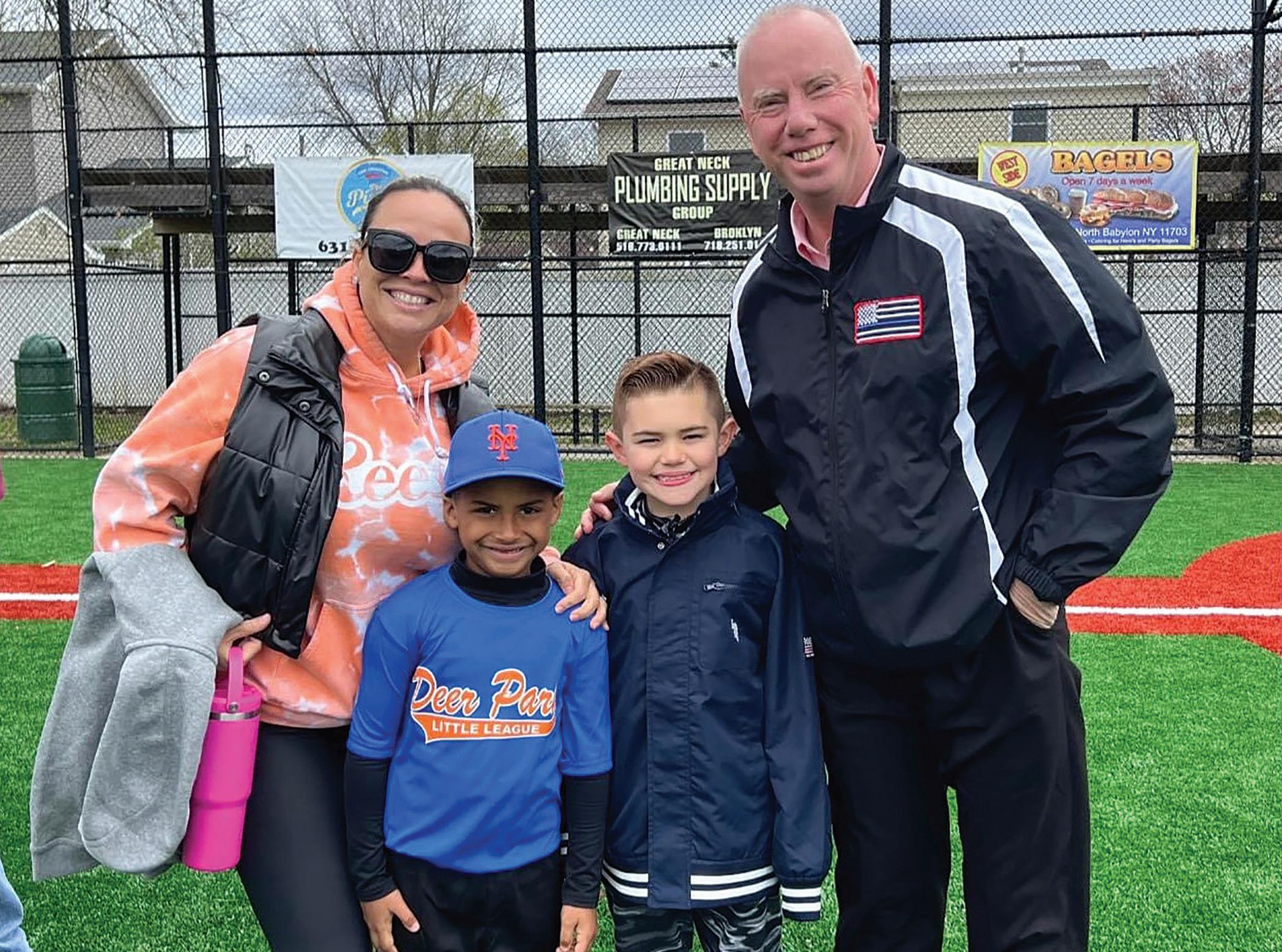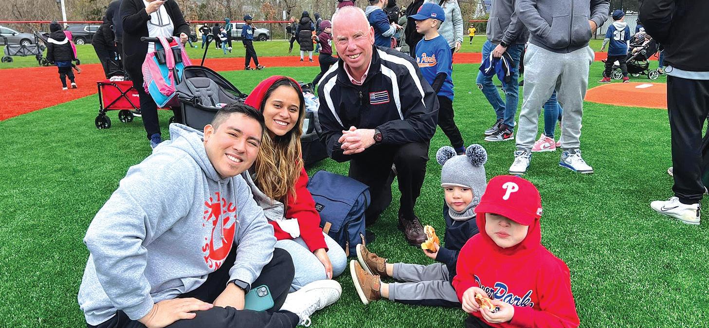 DEER PARK LITTLE LEAGUE’S OPENING DAY - Suffolk Legislator Tom Donnelly joins enthusiastic players, coaches and parents at the Deer Park Little League’s Opening Day Ceremonies at Pine Acres Park on Saturday, April 13.