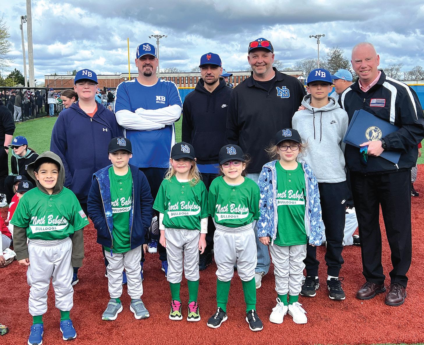 NORTH BABYLON YOUTH LEAGUE’S OPENING DAY - Suffolk Legislator Tom Donnelly joins enthusiastic players, coaches and parents at the North Babylon Youth League’s Opening Day Ceremonies at Phelps Lane Park on Saturday, April 13.