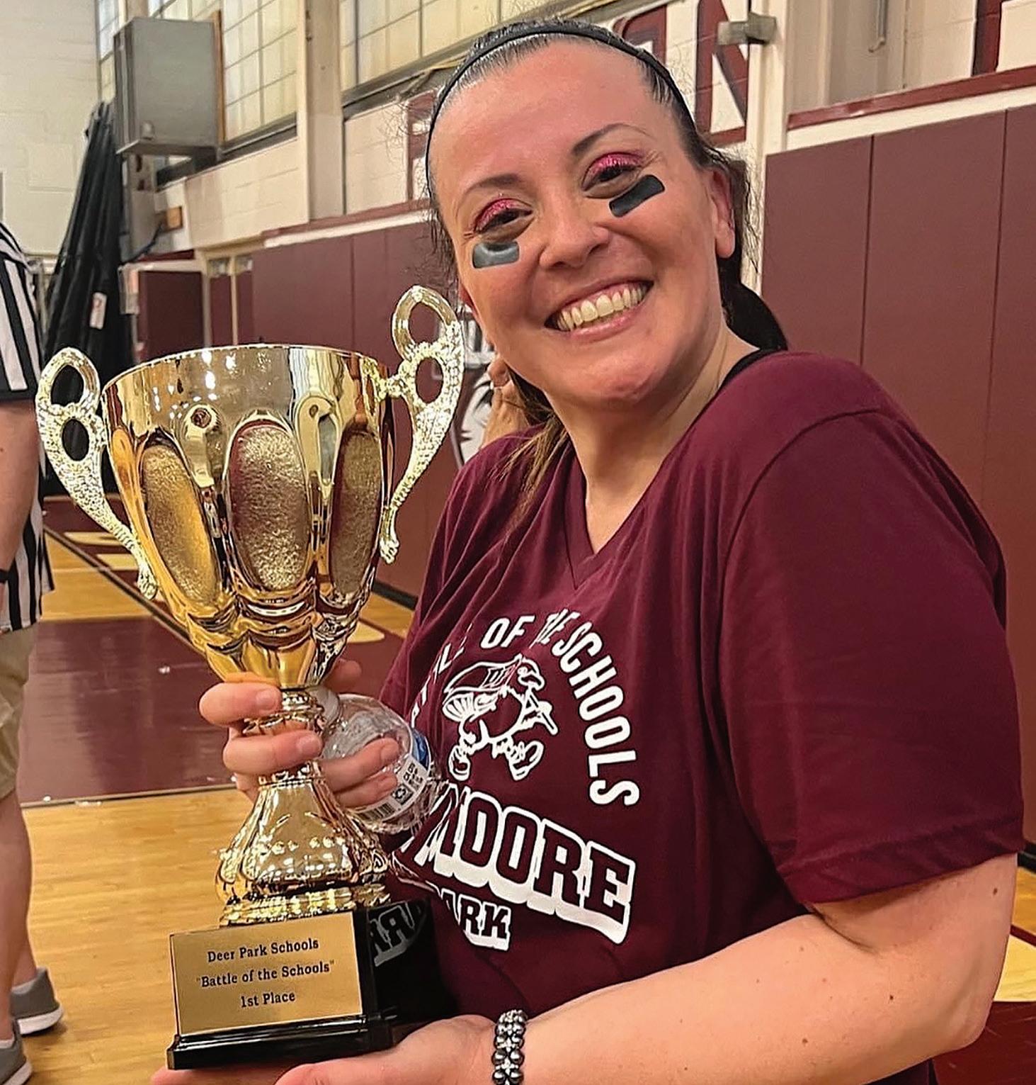 FIRST-PLACE TROPHY - May Moore Primary School Principal Tammy Alcalde with the Battle of the Schools first-place trophy. Photo courtesy of Deer Park School District