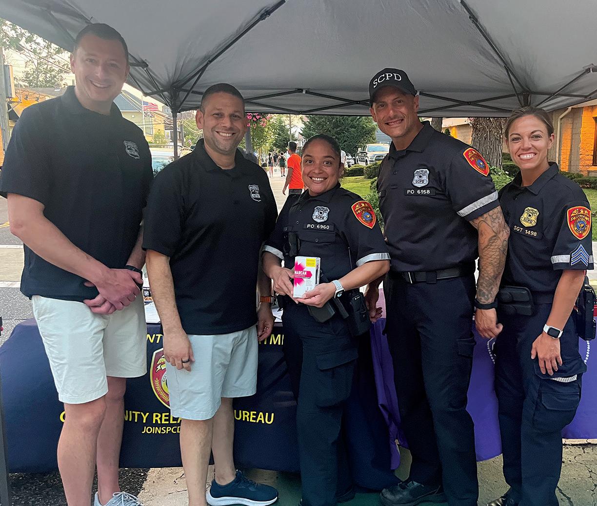 SCPD Emergency Medical Service Officers Alex Trzepizur and Jason Byron; Suffolk County Police Officers Tyana Kurz; Vincent Maio and Sgt, Ashley Dormer all worked together in distributing Narcan to Summer Block part attendees. Photos by Carole Trottere