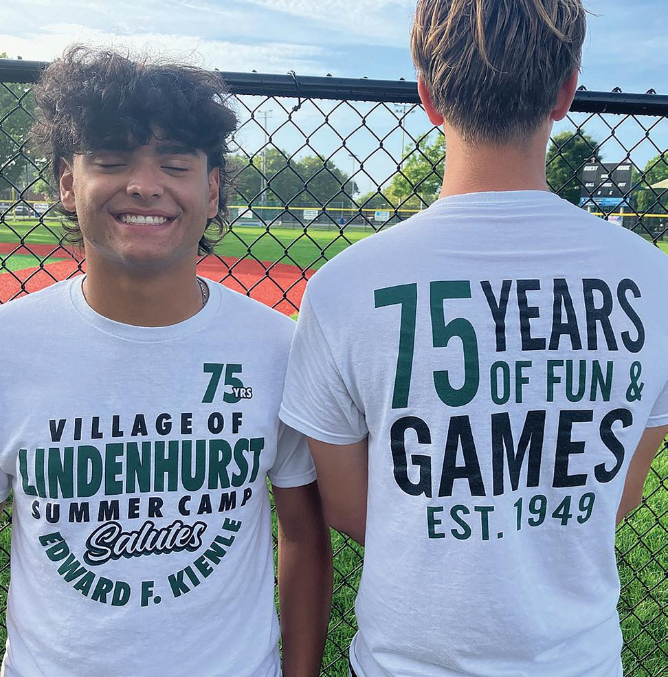 LINDENHURST VILLAGE CAMP CELEBRATING ITS 75TH ANNIVERSARY - Seventy-five years is a long time. Seventy-five years of serving the youth of Lindenhurst is a long, proud time! The Lindenhurst Village Camp is celebrating its 75th Anniversary this summer. Founded by Edward F. Kienle, in conjunction with the Village of Lindenhurst and Lindenhurst School District, the program has been a staple of the community since 1949. Pictured here (left to right) modeling this year’s commemorative Edward F. Kienle staff shirts are Camp Counselors Mike DiGiuseppe and Dan Narowski.