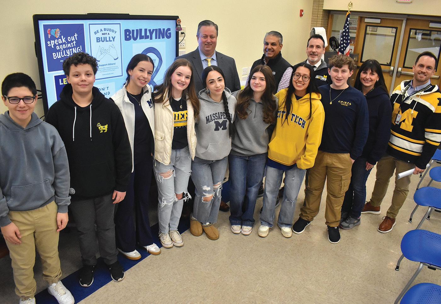 Ninth grade presenters from the Ames Campus were joined by Superintendent Dr. William Brennan, Berner Middle School Principal Jason Esposito, Assistant Superintendent for Curriculum and Instruction Dr. Brian Trapani and freshmen class advisor Ed Boyle. Photo courtesy of the Massapequa School District