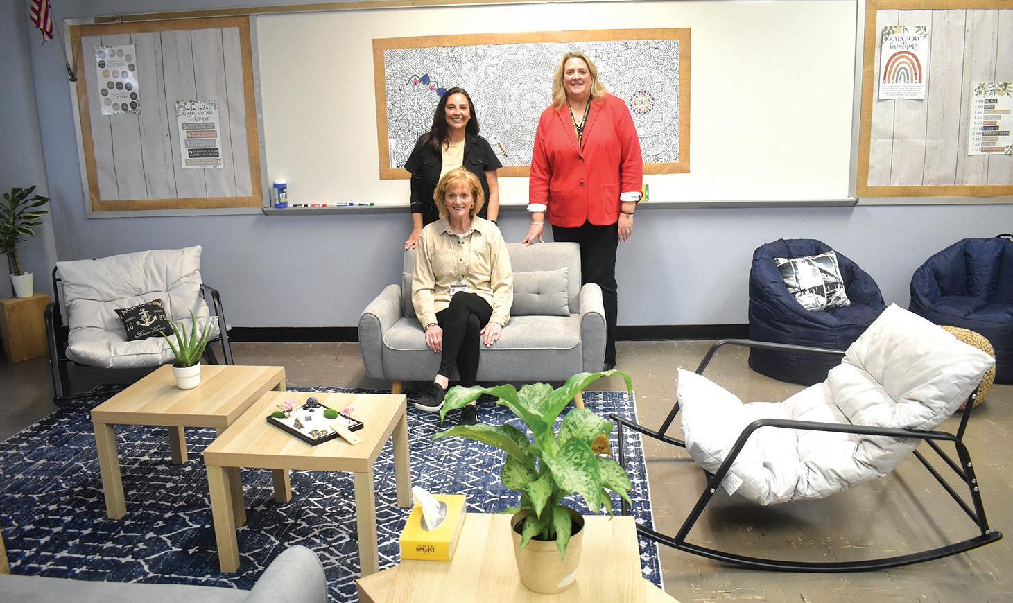 CALM CORNER - Massapequa High School social workers Marisa Boulukos, left, and Joanne Waters, seated, and Principal Barbara Lowell introduced Calm Corner as a space for students to destress with the recommendation of a PPS professional. Photo courtesy of the Massapequa School District