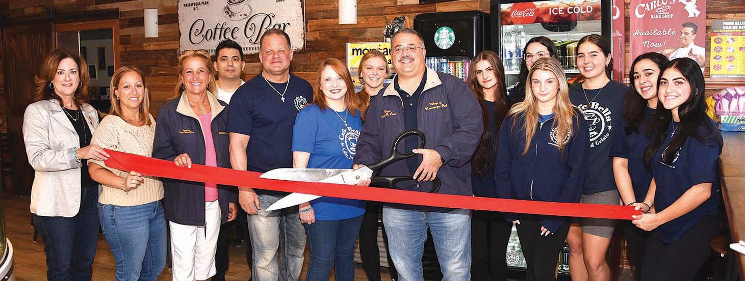 Mayor Daniel Pearl, Deputy Mayor Tina Schiaffino, Trustees Dana Durso, and Christine Wiss joined owners Steve Vaccaro and Dawn Lamont to help cut the ceremonial ribbon celebrating the opening of Cafe Bella on Merrick Rd in Massapequa Park. Pictured here from L-R: Trustee Christine Wiss, Trustee Dana Durso, Deputy Mayor Tina Schiaffino, Owner Steven Vaccaro, Owner Dawn Lamont, Mayor Daniel Pearl, and members of the staff including Shannon Russell, Hailey Dwyer, Marianna Fortunato, Rebecca Green, Julia Cichenczyk, Grace LeViness and Adrianna Bertoncici. Photo courtesy of Ed Cox