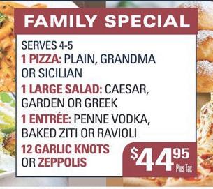 7 MASSAPEQUASOUTH BAY’S NEIGHBOR NEWSPAPERSWEDNESDAY, AUGUST 30, 2023 • WWW.LONGISLANDMEDIAGROUP.COM 1 DOZEN GARLIC KNOTS PASTA DAY Complete Dinners 40 Choices of Pasta Includes: House Salad, Giovanni’s Fresh Garlic Knots, NY Cheesecake & Coffee or Tea Only With Purchase Of Large Pie Specialty Pies Not Included. Not to be combined with any other special. Valid Every Day Except Friday. With Coupon. Expires 9/6/23 Per Person No Coupon Necessary NO CHEESECAKE ON “TO GO” ORDERS $1895 COUPON WEDNESDAY Free Not to be combined with any other special. Expires 9/6/23 No Coupon Necessary Not to be combined with any other special. Expires 9/6/23 Per Person Take Out Only Take Out Only $2 OFF GRANDMA OR SICILIAN PIE LARGE REGULAR PIE MONDAY CHICKEN DAY CHOICE OF: Includes:Spaghetti,HouseSalad, GarlicKnots,NYCheesecake& Coffee or Tea CHICKEN CACCIATORE CHICKEN FRANCESE CHICKEN MUSHROOMS CHICKEN MARSALA GRILLED BREAST VODKA GRILLED CHICKEN BREAST CHICKEN PARMIGIANA CHICKEN PUTTANESCA CHICKEN PICCATA CHICKEN SCARPARIELLO $200 $2295 COUPON COUPON THURSDAY’S SPECIAL TUESDAY’S SPECIAL 414587N083023 All other dishes available in trays upon request. Bread or Garlic Knots included with trays. Deposit required on all orders. Tax additional. Giovanni Catering OFF NO CHEESECAKE ON “TO GO” ORDERS HALF TRAY FULL TRAY GLUTEN FREE PIZZA & PASTA NOW SERVING ROOM AVAILABLE FOR GRADUATIONS, BIRTHDAYS, SHOWERS, ANNIVERSARIES, AND ALL SPECIAL OCCASIONS (UP TO 50 PEOPLE) HOUSE SALAD 40.00 67.00 GREEK SALAD 50.00 87.00 CAESAR SALAD 45.00 77.00 CHICKEN FINGERS 45.00 87.00 FRESH MOZZARELLA & TOMATO 55.00 102.00 BROCCOLI RABE & SAUSAGE 65.00 120.00 BAKED CLAMS 60.00 110.00 FRIED CALAMARI 60.00 110.00 SWEET CHILI CALAMARI 60.00 110.00 COLD ANTIPASTO 55.00 100.00 MEATBALLS IN TOMATO SAUCE 55.00 110.00 SAUSAGE IN TOMATO SAUCE 55.00 110.00 PENNE ALA VODKA 60.00 110.00 STUFFED SHELLS 60.00 110.00 LASAGNA 65.00 120.00 PENNE WITH BROCCOLI AND CHICKEN 60.00 110.00 LINGUINE WITH WHITE CLAM SAUCE 65.00 120.00 LINGUINE WITH RED CLAM SAUCE 65.00 120.00 BAKED ZITI 60.00 110.00 PENNE ANTIONIO 65.00 120.00 SAUSAGE & PEPPER PIZZAIOLA 65.00 120.00 MUSSELS MARINARA 55.00 100.00 CALAMARI MARINARA 70.00 130.00 CHICKEN MARSALA 70.00 120.00 CHICKEN PARMIGIANA 70.00 120.00 CHICKEN FRANCAISE 70.00 120.00 CHICKEN GIOVANNI 75.00 140.00 CHICKEN CACCIATORE (BONELESS) 70.00 125.00 EGGPLANT PARMIGIANA 65.00 120.00 EGGPLANT ROLLATINE 65.00 120.00 VEAL CUTLET PARMIGIANA 75.00 140.00 VEAL SCALLOPINE PIZZAIOLA 75.00 140.00 VEAL MARSALA 75.00 140.00 VEAL GIOVANNI 80.00 150.00 SHRIMP PARMIGIANA 90.00 170.00 SHRIMP SCAMPI 90.00 170.00 WWW.GIOVANNISOFMASSAPEQUANY.COM 5612 MERRICK ROAD, MASSAPEQUA Across From Lidl Supermarket (516)799-7326 • (516)798-5217 Open Mon.-Thurs. 11am-10pm; Fri. & Sat. 11am-11pm, Sun. 12 Noon - 10pm F U E L STEVEN P. CARROLL INC. FUEL OIL Full Service Quality at Low COD Prices 516-795-4638 • 516-799-5465 A Local Massapequa Company LOW PRICES ON C.O.D. Home Heating Oil EXPERT Oil Burner Service Licensed & Insured 344456N083023 414637N083023 NEW YEAR! 238 BROADWAY • AMITYVILLE 631-264-8800 FREE SERVICE CONTRACTS AVAILABLE + PARTS $99 Credit Cards Same As Cash We Accept HEAP, Social Services, and Project Warmth. TUNE-UP SPECIAL $3.199 Per Gallon! INFLATION BEATING COUPON 500 Gallon Minimum For This Price. This Coupon Also Valid For 7¢ Off Other Gallon Pricing. Expires 9/5/23 All Specials On This Ad Are Valid With This Coupon OIL BURNER, A/C FREE DIAGNOSTIC SB Veterans & Senior Discounts Master Plumber Lic # 1681 24/7 Emergency Delivery and Burner Repair Available