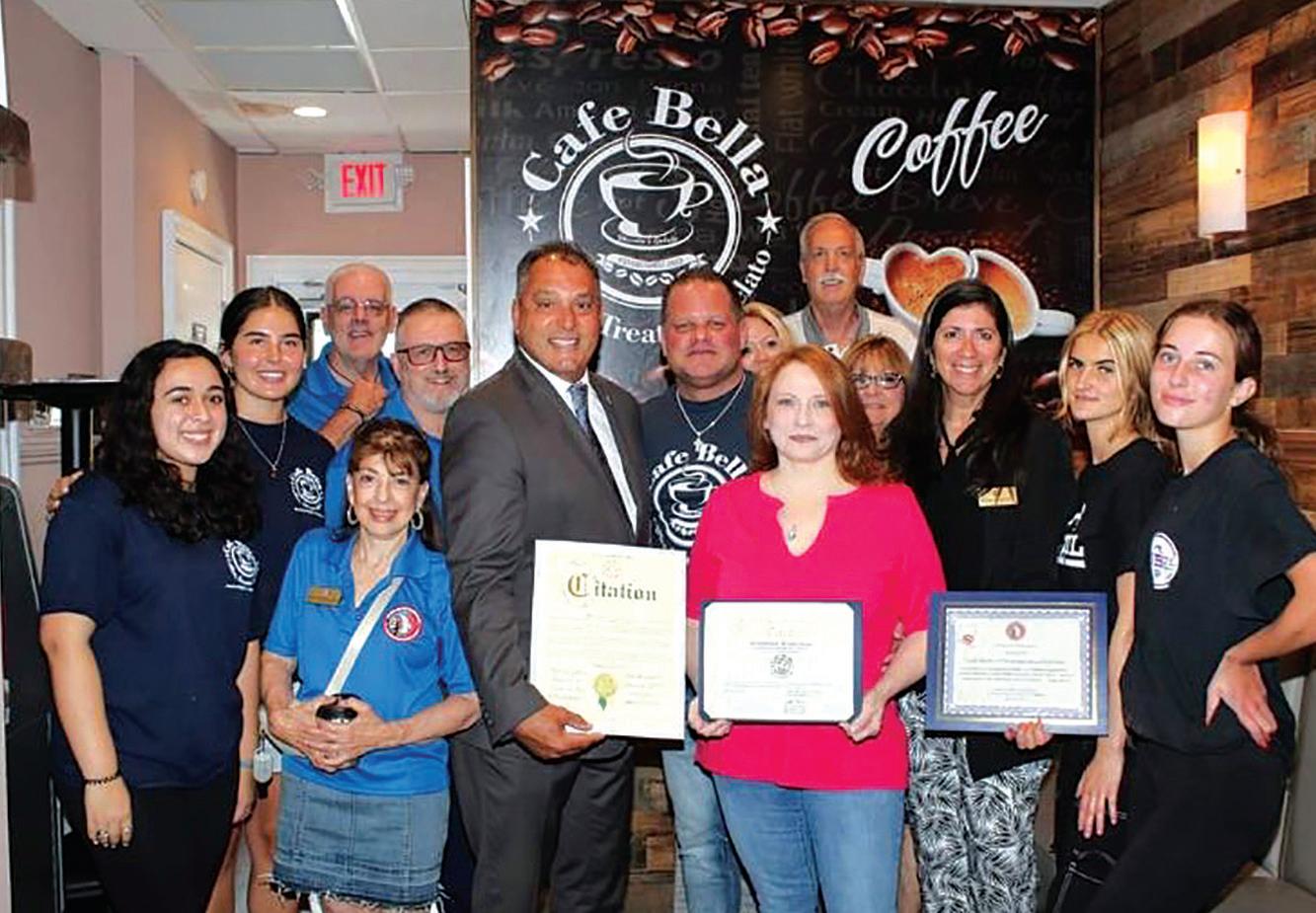 - The Massapequa Chamber of Commerce recently held a Ribbon Cutting Ceremony for Cafe Bella of Massapequa Park. Congratulations to owners Steven Vaccaro and Dawn Lamont - check them out at 4863 Merrick Rd., Massapequa Park. On hand to celebrate were owners Steve Vaccaro and Dawn Lamont, Robin Hepworth — First Vice President, Robert Barrett — Board of Directors, Howard Ritzer — Board of Directors, Tim Ryan — Board of Directors, Isabelle Rapaciullo — Board of Directors, Joseph Saladino — Town of Oyster Bay Supervisor, Vicki Walsh — Town of Oyster Bay Councilwoman, Lanie Altman — Representative for Michael Durso, and Bonnie Schifano — South Bay’s Neighbor.