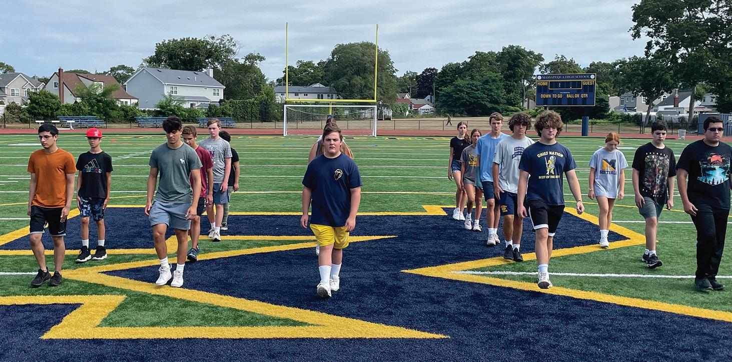 the high school. They were on the turf field and in the band room to get ready for this year’s show. It will be performed at four home football games and at the annual Newsday Marching Band Festival on Oct. 19 at Mitchel Field.