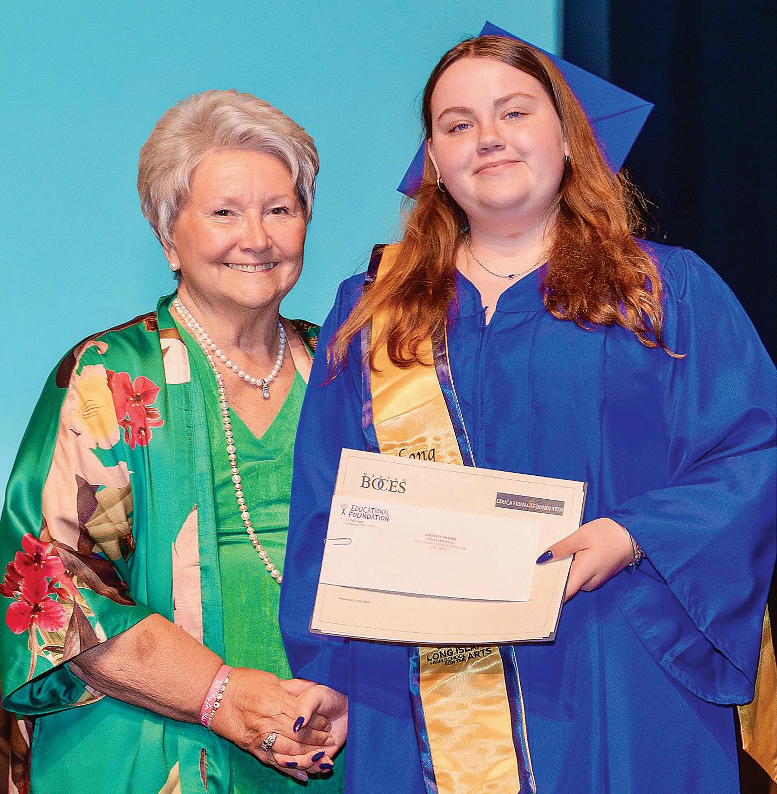Massapequa student Addison Moore (right) is congratulated on earning the Dr. Robert R. Dillon Outstanding Teamwork Award by Ava Favara, Founding Principal of Nassau BOCES Long Island High School for the Arts.