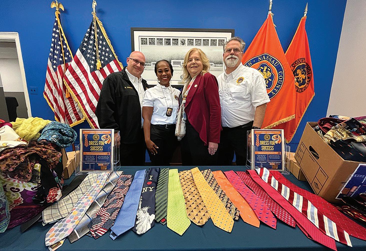 NCDA’S DRESS FOR SUCCESS DRIVE - Nassau County District Attorney Anne T. Donnelly was joined by leadership from the Nassau County Probation Department to deliver ties and dress scarves collected during NCDA’s Dress for Success Drive. Over the month-long initiative, district attorney’s office employees donated new and gently used ties and dress scarves to help justice-involved individuals ending their probation feel confident during job interviews, with the goal of setting them up for lasting success. Through the generosity of NCDA employees, more than 200 ties and nearly three dozen scarves were collected and donated to the Probation Department’s employment program. L-R: Nassau County Probation Chief Deputy Director Matthew Granoff, Assistant Deputy Director Aleisha Garvin, District Attorney Donnelly, and Director John Plackis. Photo courtesy of Nassau County District Attorney’s Office