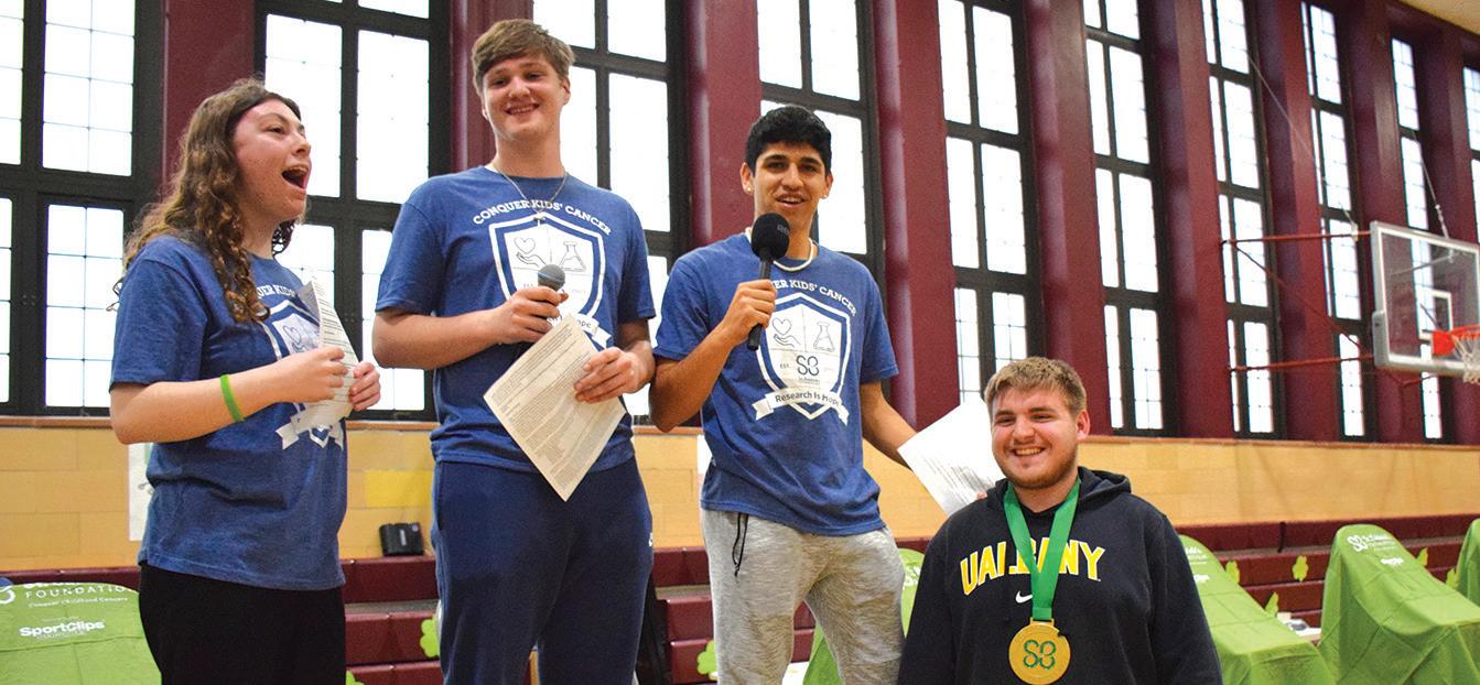 emcees honored Mepham senior, Thor Bjornsson, for raising the most money for the Chop Your Locks for Charity event. Photos courtesy of the Bellmore-Merrick Central High School District