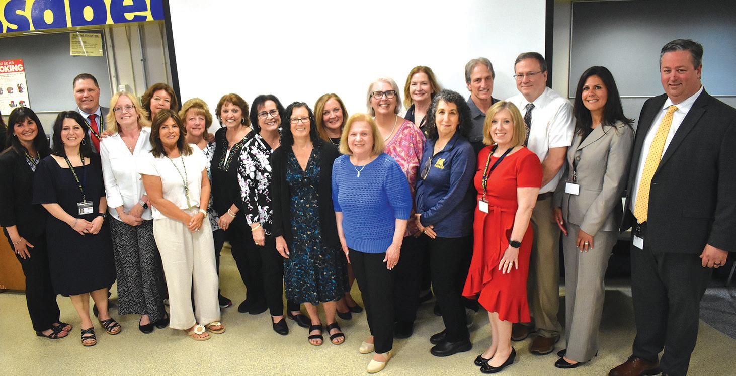 SCIENCE STUDENTS LAUDED AT RESEARCH SYMPOSIUM - Science research teachers August Eberling, Karen Calabrese and Dr. Paul Hesleitner were joined by students from Massapequa High School, the Ames Campus and Berner Middle School at the annual Science Research Symposium on May 22. Photo courtesy of the Massapequa School District