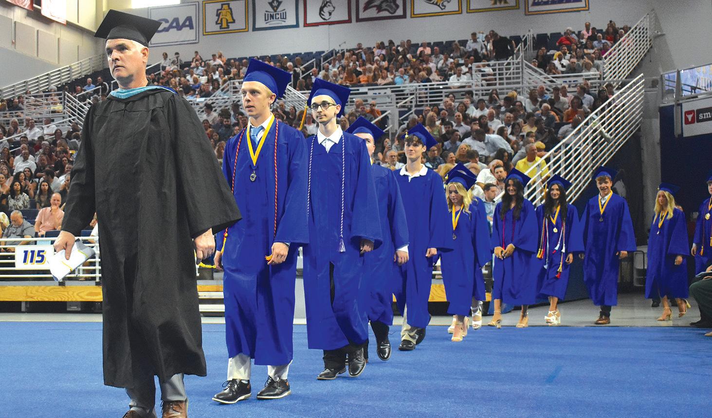 Retiring Executive Assistant to the Principal Michael Quigley led graduates into the arena.