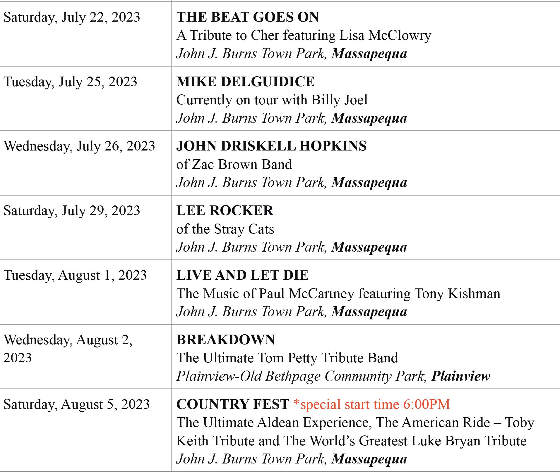 Supervisor Joseph Saladino and members of the Town Board announce the return of “Music Under the Stars” – a free summer concert series – which kicks off on Wednesday July 5th and features a wide variety of genres ranging from country to rock. All concerts begin at 8pm unless otherwise noted below. For comfort,