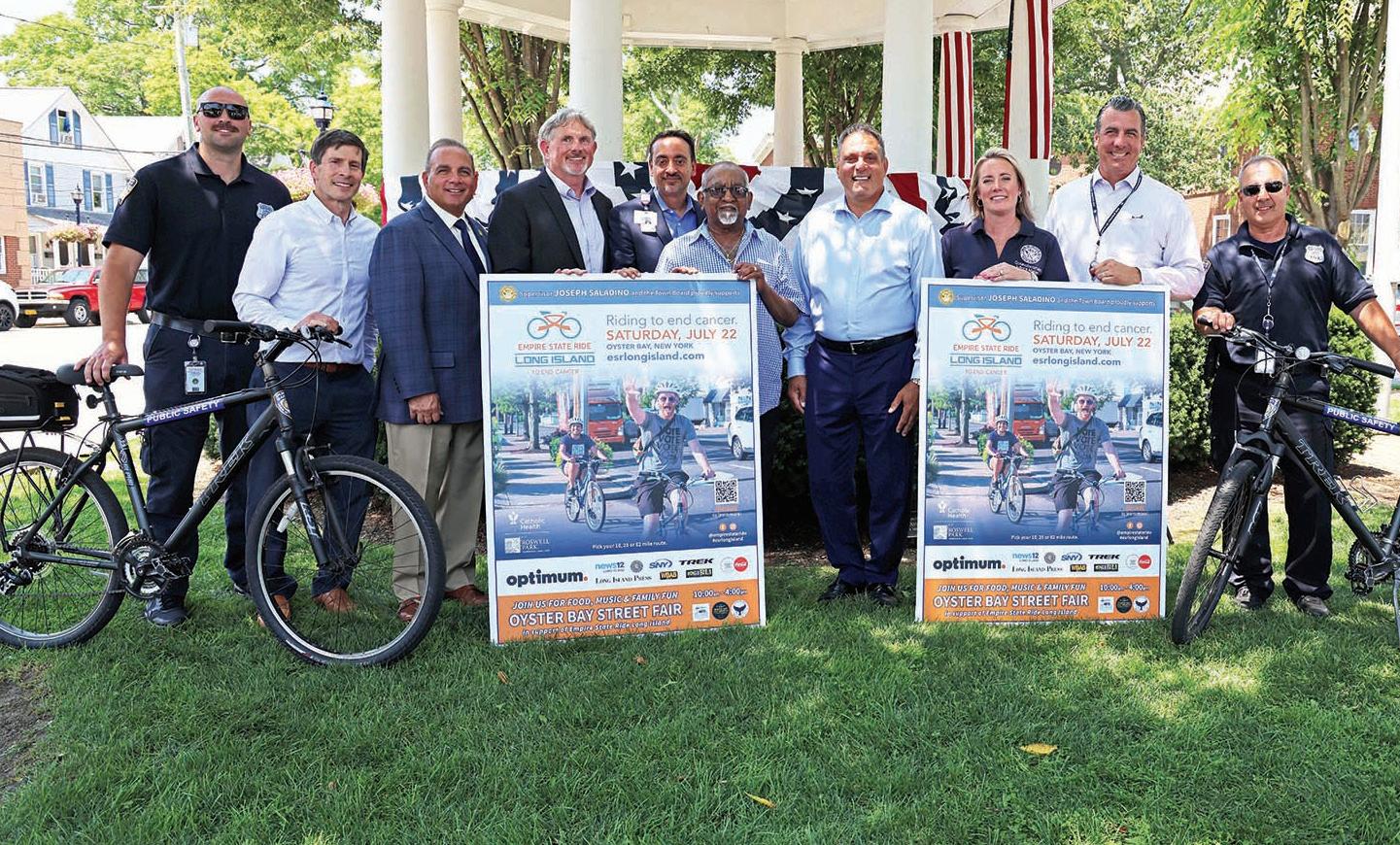- Oyster Bay Town Supervisor Joseph Saladino joined with Councilman Steve Labriola, Councilwoman Vicki Walsh and Town Receiver Jeff Pravato to announce the Town’s partnership with Empire State Ride Long Island to host Long Island’s largest charitable bike ride to benefit cancer research, scheduled for Saturday, July 22nd. Those interested in learning more or signing up to ride and raise funds for the event, should visit www. esrlongisland.com.