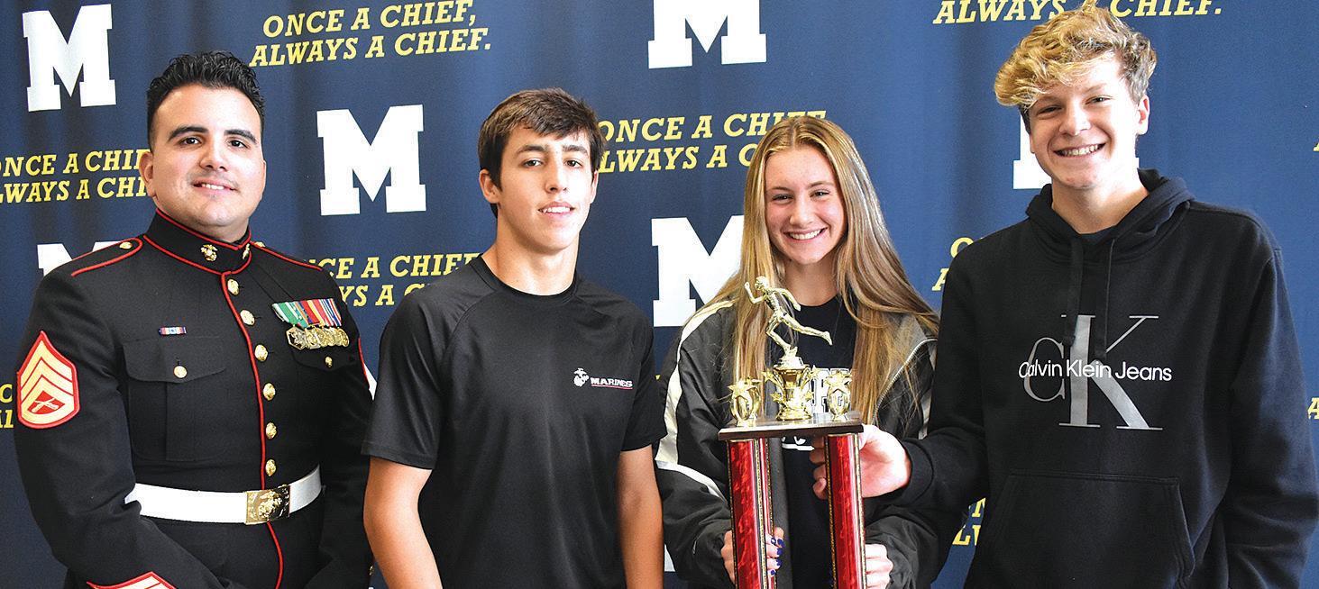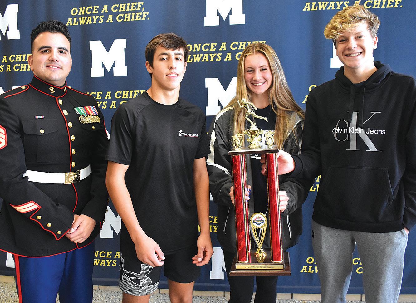 Marine Corps Staff Sgt. Diego Albino presented Massapequa High School with its championship trophy from a fitness challenge that took place in physical education classes. Proudly accepting the award were juniors, from left, Joseph Marlow, Briana Neary and Jack Holden. Photo courtesy of the Massapequa School District