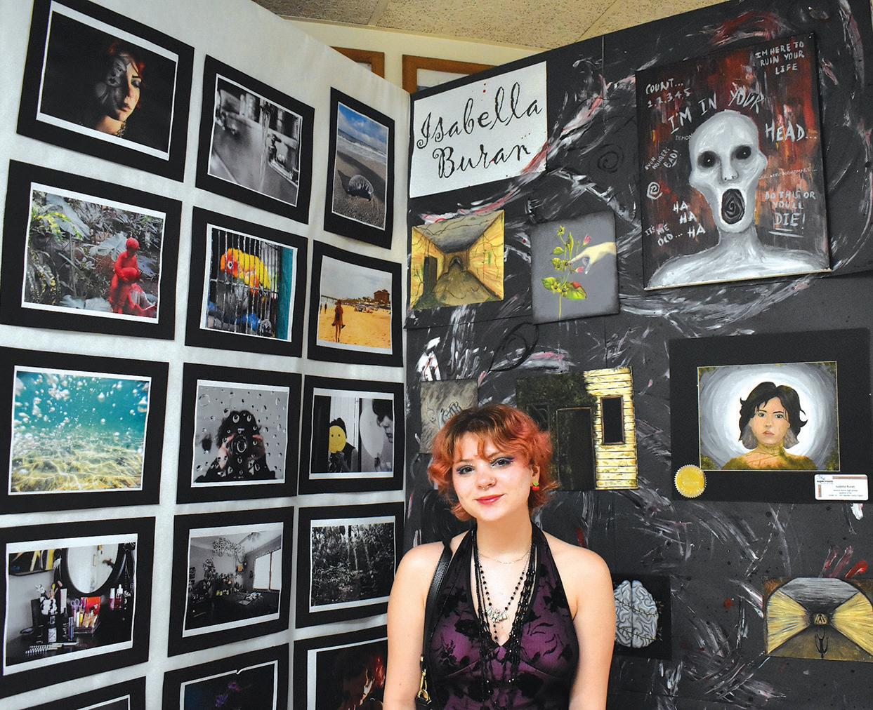 gallery walk. Students from the AP Art class showcased the work from their portfolio projects. Teacher Curtis Tripoli said that each artist completed a sustained investigation by picking a theme and creating 15 images that answered his or her inquiry question. The students worked with a variety of mediums, from drawing to painting to photography.