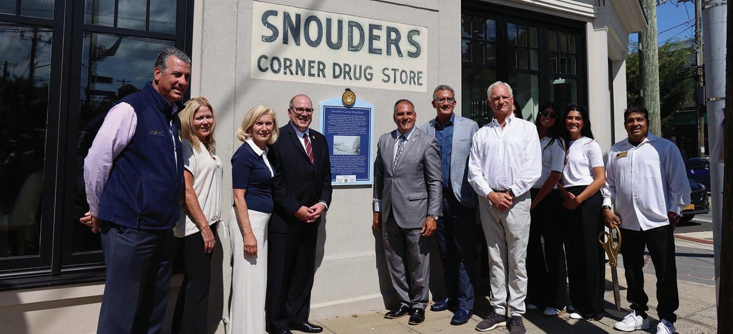 Officials, including Supervisor Joseph Saladino, Town Clerk Rich LaMarca, Councilwoman Vicki Walsh, Receiver of Taxes Jeff Pravato, and Nassau County Comptroller Elaine Phillips, joined with property owners and chamber representatives to unveil a historical marker at the location of Snouders Corner Drug Store.