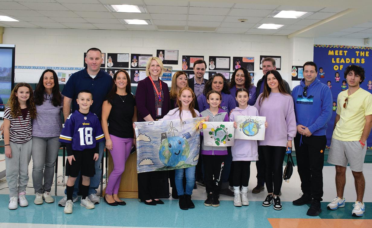 STUDENT’S FLAG TO FLY WITH POLE TO POLE ELECTRIC VEHICLE EXPEDITION - Edward J. Bosti Elementary School student Grace Cortright was announced the worldwide flag design contest winner for the upcoming Pole to Pole electric vehicle exhibition. Pictured front, l-r: Edward J. Bosti Elementary School Pole to Pole electric vehicle exhibition flag design contest winner Grace Cortright and design runners-up Anastasia Schretzmayer and Gracyn Ebner are pictured with their families, (back, l-r) Assistant Superintendent for Instruction Christina Poppe, Principal Laura Kimball, News-O-Matic host Russell Kahn, board of education president Jaclyn Napolitano-Furno and trustee Brian J.