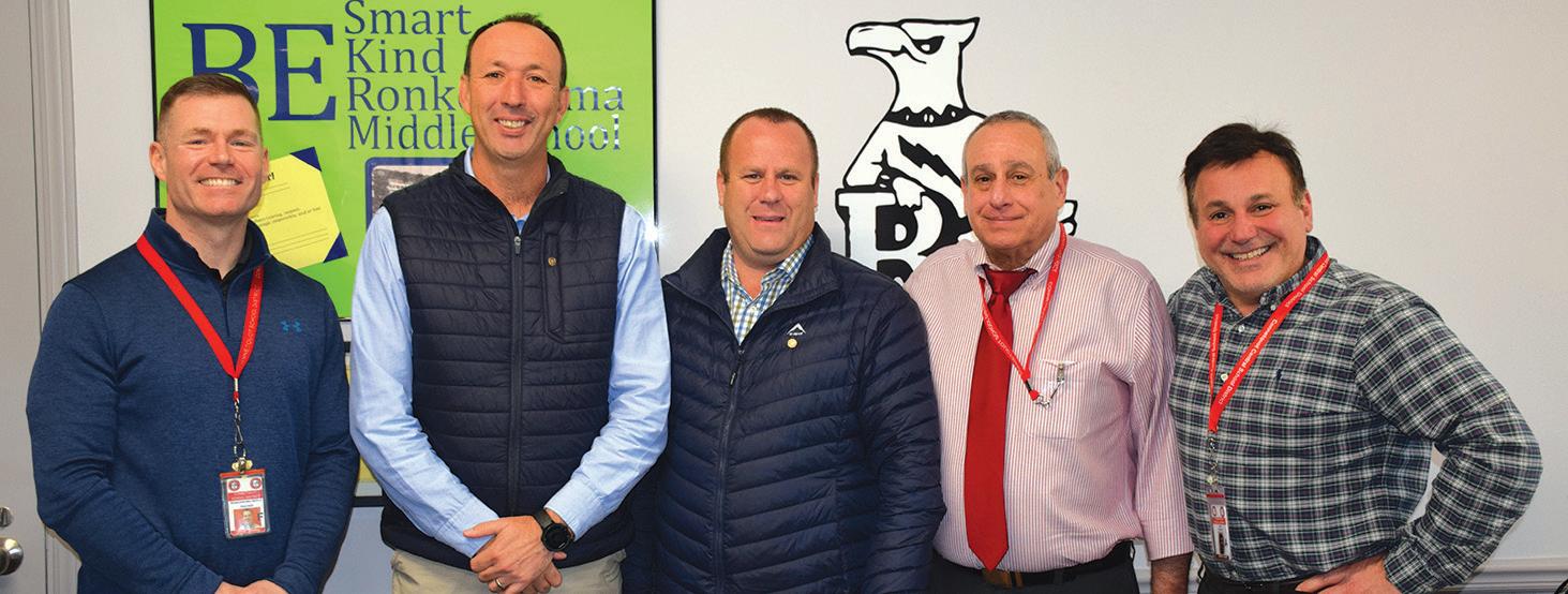 INTERNATIONAL GUESTS VISIT CONNETQUOT SCHOOLS - Connetquot Central School District’s Ronkonkoma Middle School and Helen B. Duffield Elementary School showcased their buildings’ stellar educational programs and facilities during a visit by South African school administrators (Center, l-r), Swellendam Primary Principal Jaco Swart and Swellendam High School Principal Nicolas Pelser are pictured with, from left, Ronkonkoma Middle School teacher Justin Bradley, interim Assistant Principal Mark Brodsky and Principal Joseph Licato. Photo courtesy of the Connetquot Central School District