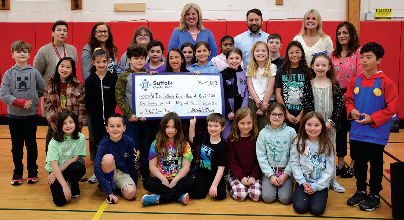 Edward J. Bosti Elementary School’s Helping Hands Club donated $825 to St. Jude Children’s Research Hospital collected during a recent coin collection. Suffolk Federal Credit Union matched the school’s collection for a