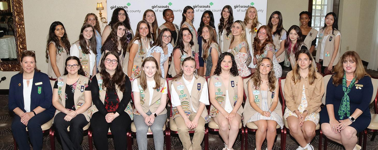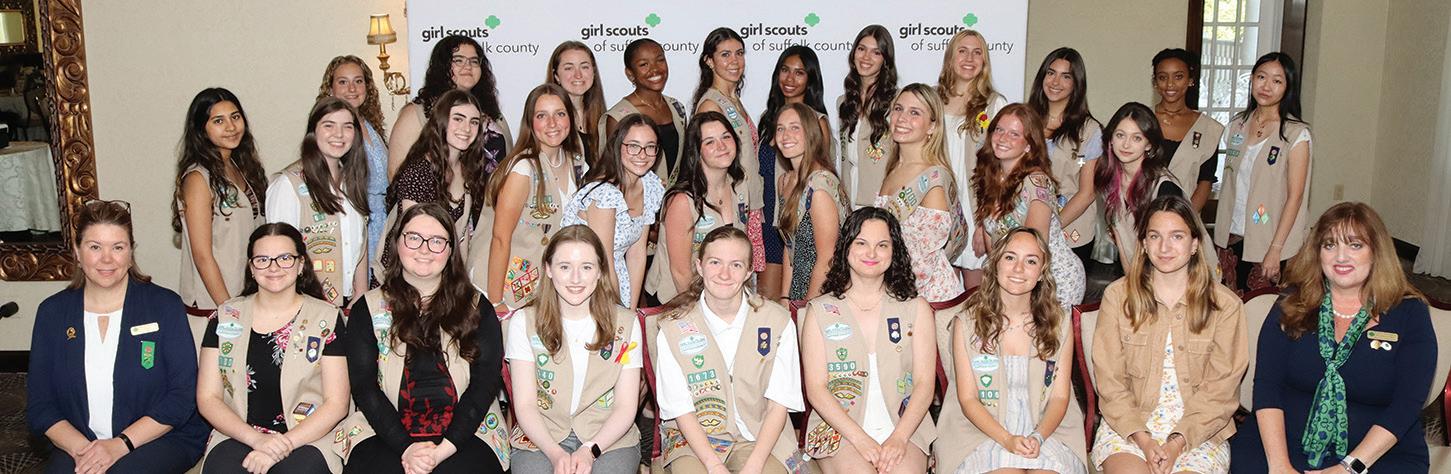 EARN PRESTIGIOUS GIRL SCOUT GOLD AWARD - The Girl Scouts of Suffolk County recently celebrated local Girl Scouts who earned the prestigious Girl Scout Gold Award, including 7 members of Sachem North Service Unit 603, Sachem East Service Unit 618, Stony Brook Service Unit 652 and Setauket Service Unit 656. (L-R) Girl Scouts of Suffolk County’s Gold Award Class of 2023 with Donna Smeland, GSSC Chair of the Board and Tammy Severino, GSSC President & CEO.