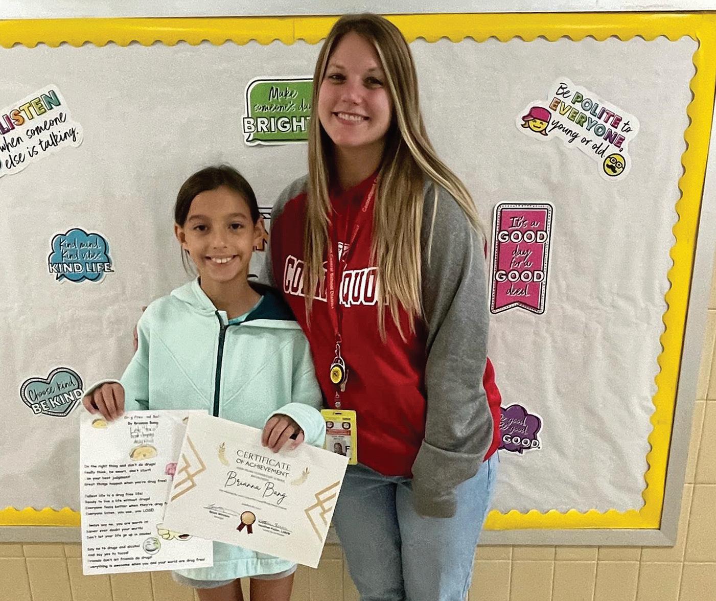 LET’S TACO-BOUT STAYING DRUG-FREE - John Pearl Elementary School student Brianna Bang was the winner of the school’s poetry contest held for United We Stand for a Drug-Free Week and is pictured with school social worker Heather Fuller. Photo courtesy of the Connetquot Central School District