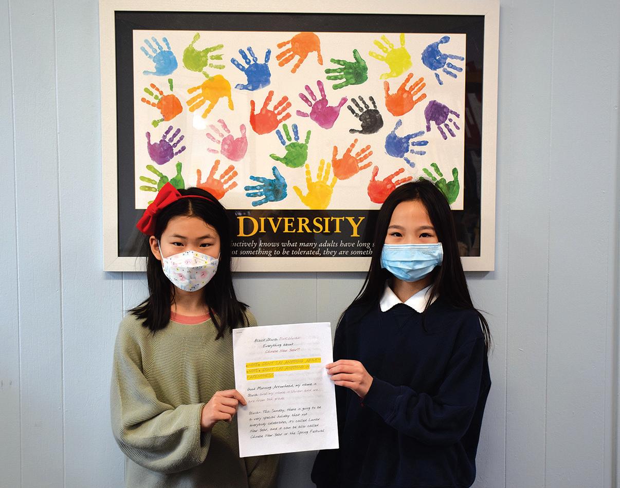 READ AN ESSAY ABOUT LUNAR NEW YEAR TRADITIONS - Across the Three Village Central School District, students and staff celebrated Lunar New Year and the Year of the Rabbit through events, activities and schoolwide displays. Two Arrowhead Elementary School fifth graders read an essay about Lunar New Year traditions to the building over the announcements. Photo courtesy of the Three Village Central School District