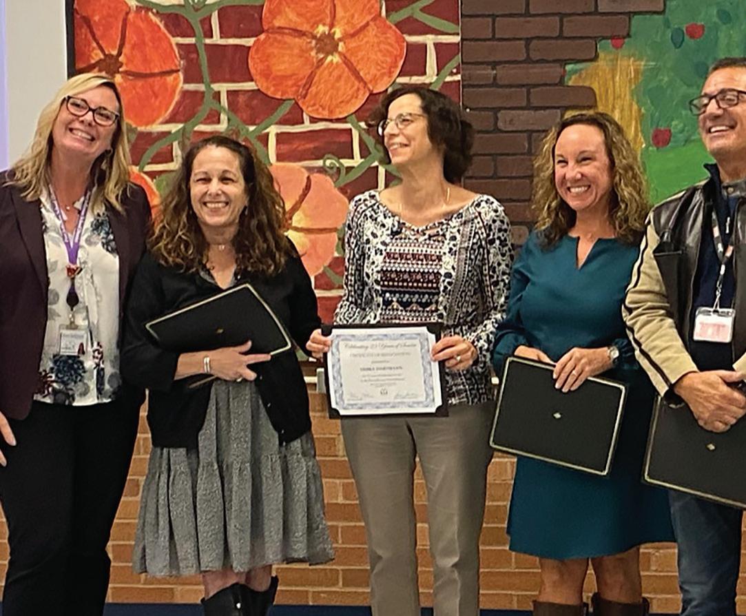 PRESENTED A CITATION - Suffolk County Legislator Kara Hahn presented Principal William Bernhard and Ward Melville High School with a citation. Photo courtesy of the Three Village Central School District