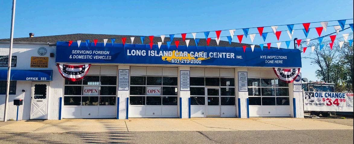 24 WEST BABYLON NORTHSOUTH BAY’S NEIGHBOR NEWSPAPERS WEDNESDAY, JUNE 7, 2023 • WWW.LONGISLANDMEDIAGROUP.COM LONG ISLAND CAR CARE CENTER INC. 333 BAY SHORE ROAD • DEER PARK • 631.213.2300 HOURS: MONDAY - FRIDAY 8AM-6PM • SATURDAY 8AM-1PM Quick Lube Checklist COMPLETE OIL & FILTER CHANGE CHASSIS LUBRICATION CHECK TRANSMISSION FLUID CHECK DIFFERENTIAL FLUID CHECK BRAKE FLUID CHECK POWER STEERING FLUID FILL WINDSHIELD WASHER FLUID CHECK AIR FILTER CHECK WIPER BLADES CHECK TIRE PRESSURE LUBRICATE DOOR HINGES CHECK PCV VALVE CHECK LIGHTS CHECK BATTERY TERMINAL CHECK ANTIFREEZE COOLANT CHECK BREATHER ELEMENT TECHNICIAN National Institute For AUTOMOTIVE SERVICE EXCELLENCE 411097N060723 HAVE A LARGE COMMERCIAL OR RECREATIONAL VEHICLE? MONTHLY PARKING SPACES AVAILABLE FOR RENT $5 OFF $10 OFF $3499 $99 $14999 SYNTHETIC OIL CHANGE A/C RECHARGE ANY SERVICE OVER $100 REGULAR OIL CHANGE FRONT OR REAR BRAKE PADS Up To 5 Quarts. Cartridge Oil Filters Extra. Reg. $79.99 +TAX Up To 1 Lb. Freon Large Vehicles Extra Includes FREE Check-Up +TAX +TAX PER SET Up To 5 Quarts. Cartridge Oil Filters Extra. Electronic Brake Systems Extra Cannot be combined with any other offer. Cannot be combined with any other offer. Cannot be combined with any other offer. $4500 FREE PRE-PURCHASE INSPECTION +TAX Let Us Inspect The Vehicle Before You Buy It! With Any Repairs Of $350 Or More Cannot be combined with any other offer. $29999 BRAKES & ROTORS INSTALLED +TAX PER SET Starting At Coated Rotors / Electronic Brake Systems Extra Cannot be combined with any other offer. $7500 FREE SCAN FRONT WHEEL ALIGNMENT REGULAR OIL CHANGE WE CARRY MERCEDES • BMW • VW CHECK ENGINE LIGHT ON?? +TAX Starting At Minivans & SUV's Extra Cannot be combined with any other offer. Cannot be combined with any other offer. Cannot be combined with any other offer. Cannot be combined with any other offer. Cannot be combined with any other offer. NEW YORK STATE INSPECTIONS DONE HERE Se Habla Español $8500 +TAX Radiator Drain/Flush/Fill Green Coolant Up to 2 Gallons. Dex-cool/Euro Coolant Extra ANTI-FREEZE SPECIAL Cannot be combined with any other offer. 5W40 FULL SYNTHETIC DISTRIBUTOR INCLUDING EUROPEAN MAKES